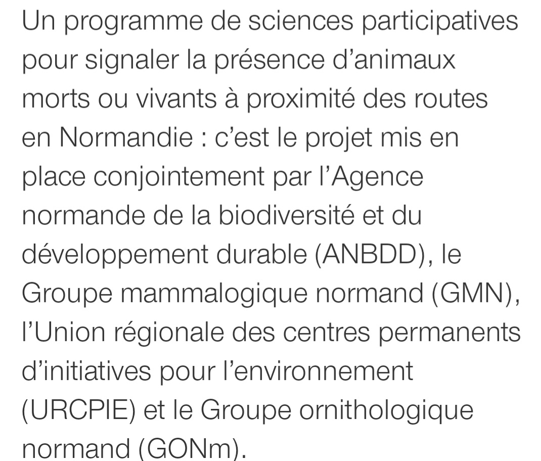 Cette application mise en place par l'ANBDD, le GMN, le GONm et les CPIE est en marche. Elle permet de recueillir toutes les données d'animaux morts observés sur les routes de Normandie. Elle concerne toutes les espèces animales.