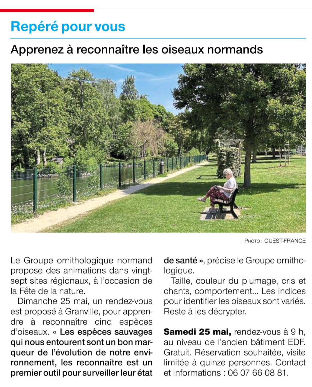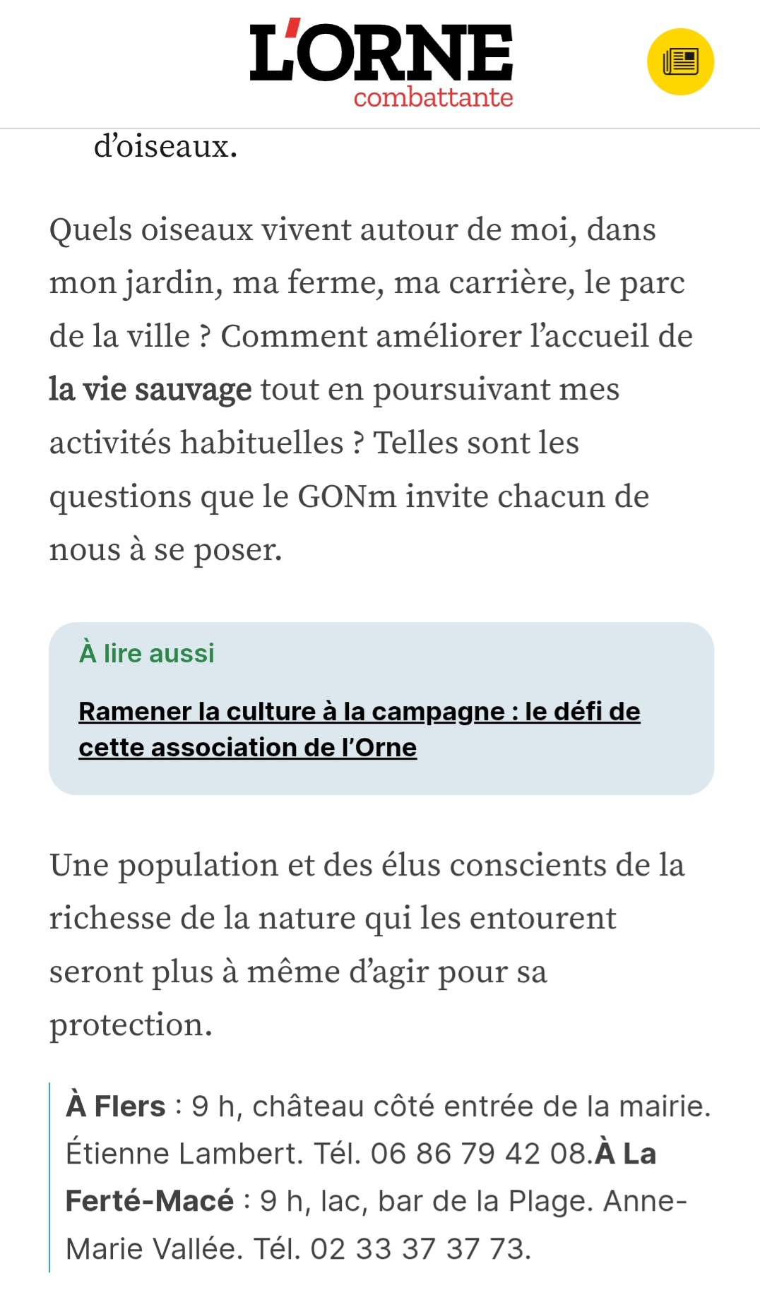 Et un article de l'Orne Combattante où se déroulait deux animations" Fête de la nature" , un article en son début et en sa fin (article numérique en de nombreuses parties truffées de publicités). Dommage l'article était complet et très informatif sur le GONm. Ci-après le lien, pour le lire dans son entièreté. https://actu.fr/normandie/flers_61169/d ... 60322.html