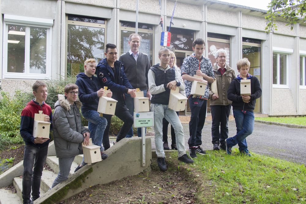 Un projet de fabrication de nichoirs lancé par Mme Dénéchère, professeur d'anglais, et M. Drieu, professeur de menuiserie, a vu le jour au début de l'année 2017. Le GONm, contacté pour fournir des conseils sur les modèles à installer, est intervenu en avril devant les élèves pour une présentation du refuge et une découverte des oiseaux fréquentant le site. Les nichoirs ont été confectionnés en septembre par les élèves de la section menuiserie, 2ème année.