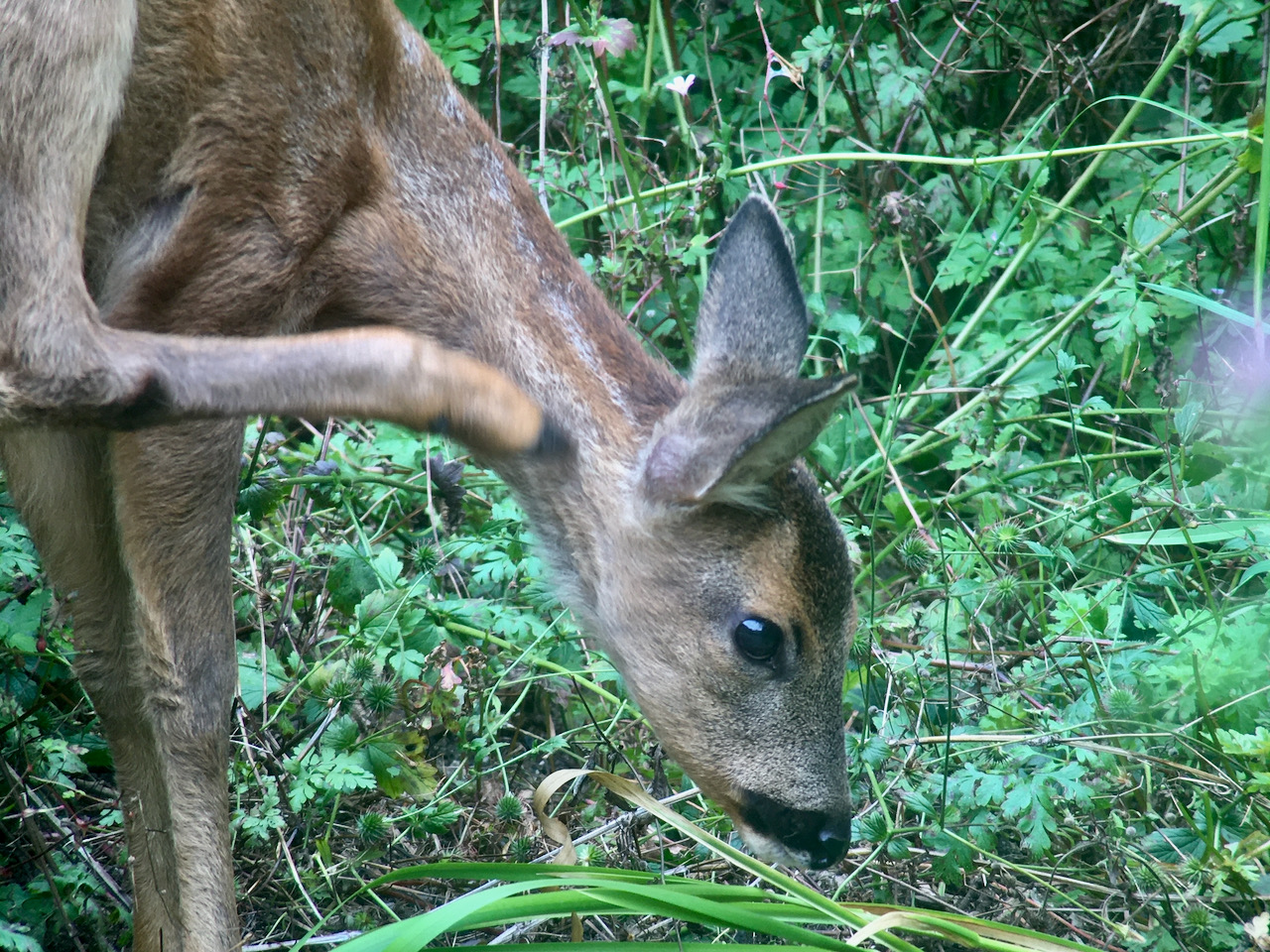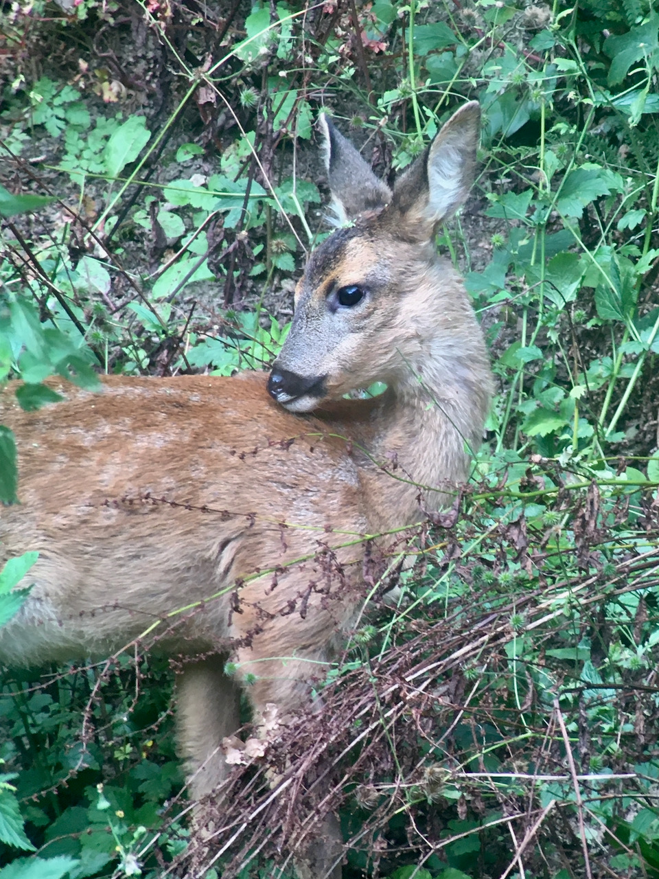 De retour dans notre jardin après 3 semaines de stage, c'est avec plaisir que nous avons pu constater qu'une chevrette et ses 2 faons avaient pris possession du site. Ce n'est pas la première fois qu'un chevreuil passe dans le jardin et vient boire dans la mare, mais le plus souvent de nuit. Toute cette petite famille profite du fouillis laissé en bordure de la mare.
