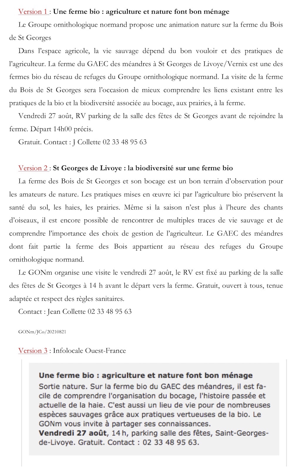 J'ai fait le test de rédiger des annonces variées pour la dernière animation à Saint-Georges-de-Livoye. L'annonce publiée par La Manche libre (pages loisirs) est un mix approximatif. Mais l'essentiel y est. J'ai reçu plusieurs coups de téléphone pour savoir s'il s'agissait d'une visite de ferme... Un groupe de 8 hérons posés sur les parcelles, un nid de guêpes gratté par le blaireau, de jeunes arbres semés par les oiseaux et le vent sous les clôtures et protégés hors broyage, les perchoirs de la buse sous les vieux arbres garnis de branches mortes sous lesquels les pelotes sont bien visibles, de même que celles de l'effraie sous les bâtiments, un groupe de gobemouches en chasse, bien actifs, les plumes de mue nombreuses, l'angle de champ en déprise, les chenilles issues des pontes de paon du jour sur les orties bien éclairées, etc, bien des motifs de plaisir! Par contre, outre le phénomène d'érosion du voisinage (la ferme des Bois de St Georges est "toute herbe"), le broyage - par le voisin- des jeunes arbres plantés par Thierry et l'arrosage débordant du débroussaillant d'un autre voisin sur ses haies sont les preuves que cette autre agriculture fait fausse route.