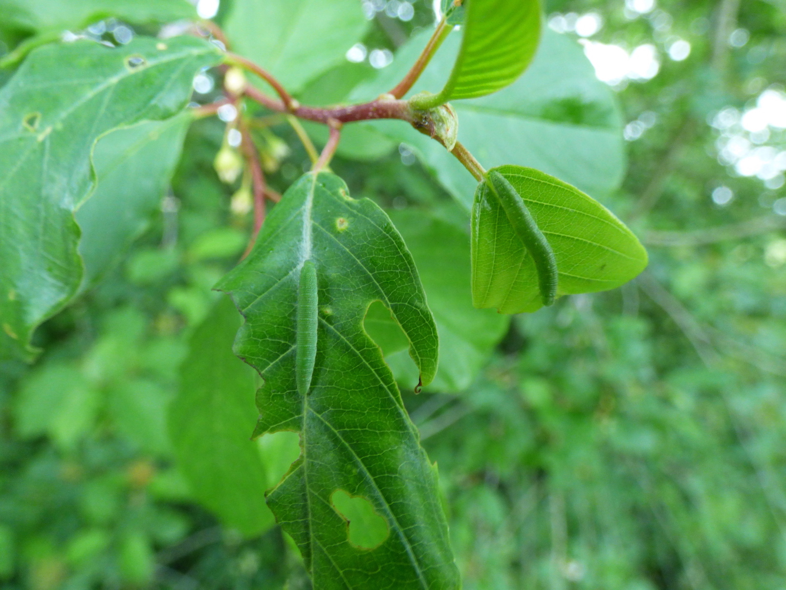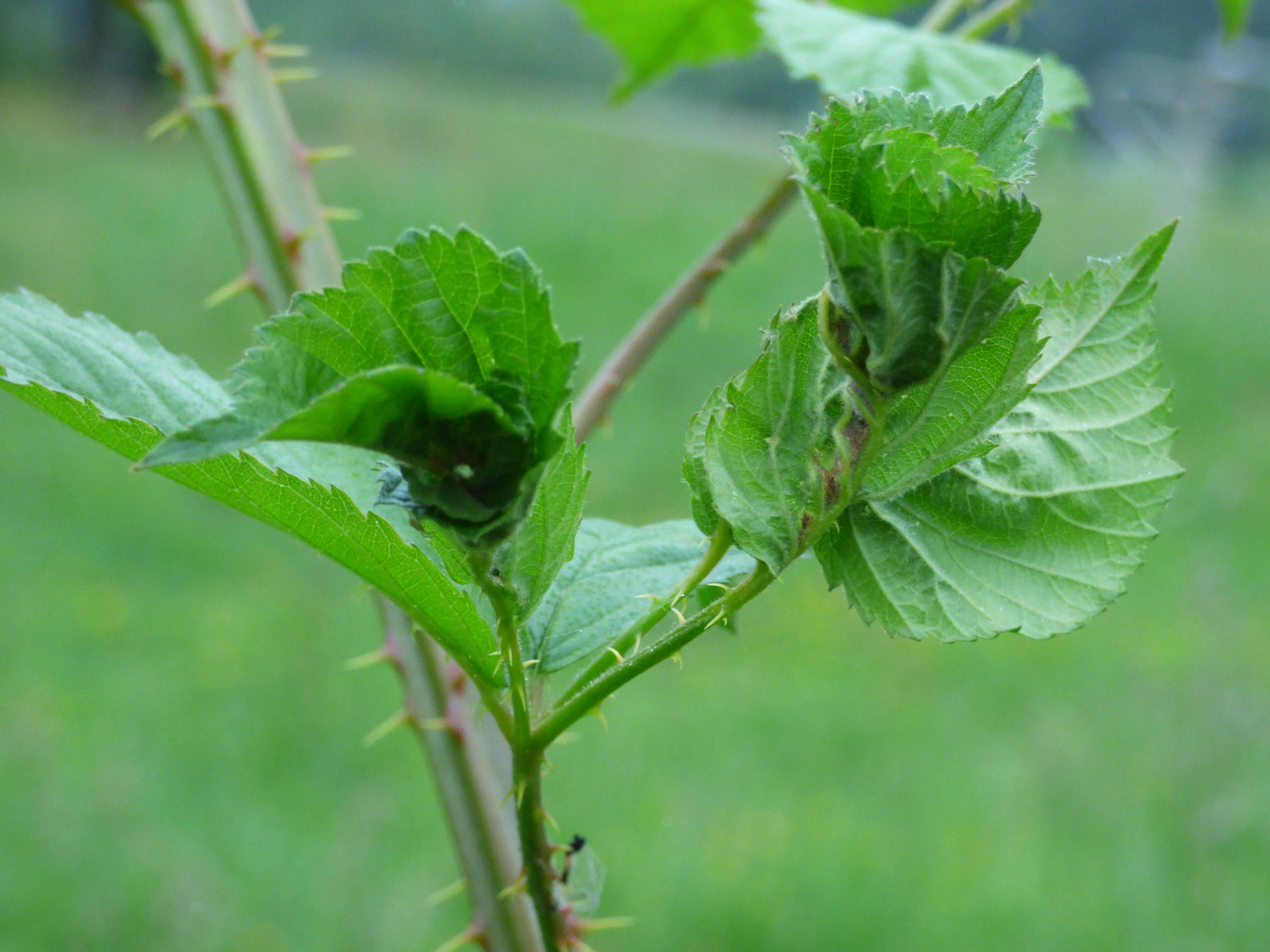 - un couple de merles affairé le long du bief : la femelle se pose derrière une grosse pierre sur la rive et s'active - je ne vois que la tête dépasser par intermittence -; elle repart à plusieurs reprises avec un paquet de vase au bec et file directement vers un buisson qui cache la nid en construction. Son comportement peu farouche m'incite à la prendre en (mauvaise) photo. Le mâle l'attaque à deux reprises, tentant probablement (?) de l'obliger à cesser ce va et vient qui dénonce son activité. - un buisson de bourdaine le long du bief accueille les chenilles du papillon Citron. Même si les entailles ne sont pas exactement symétriques dans ce cas, il y a peu de doutes sur la détermination. Le positionnement dans l'axe de la nervure principale est aussi caractéristique. Heureusement qu'il n'y a pas (?) de bourdaine horticole décorative à feuillage pourpre, les prédateurs auraient la tâche facile! C'est pourtant ce qui arrive sur les prunus, les chênes, les hêtres, les noisetiers, etc. "rouges". - pour le plaisir de la terminologie (demander l'avis des poissons aussi)... Cherchez Lee Wulf sur un moteur de recherche, le roi du hameçon sans ardillon. - Une des préconisations de gestion émises l'an dernier a été mise en oeuvre : créer un sentier le long de la rivière dans la partie non fauchée pour limiter la déambulation "erratique" des promeneurs dans la prairie. Souhait en partie exaucé, la végétation de la rive est beaucoup plus variée que celle du reste de la prairie classiquement couverte de graminées denses. Mais il va encore falloir préciser que le broyeur ne doit pas s'approcher à moins d'un mètre de la rive... - pour finir, l'énigme... Des feuilles de ronce torsadées. Qui est responsable de cette déformation?