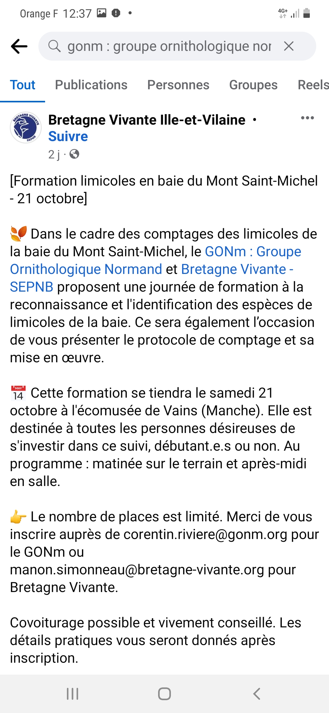 Voici l'annonce publiée sur la page Facebook du GONm. Attention toutefois, cette formation est réservée en priorité aux personnes qui s'engageront dans les suivis RLC (réseau limicoles côtiers) en baie du Mont-Saint-Michel.