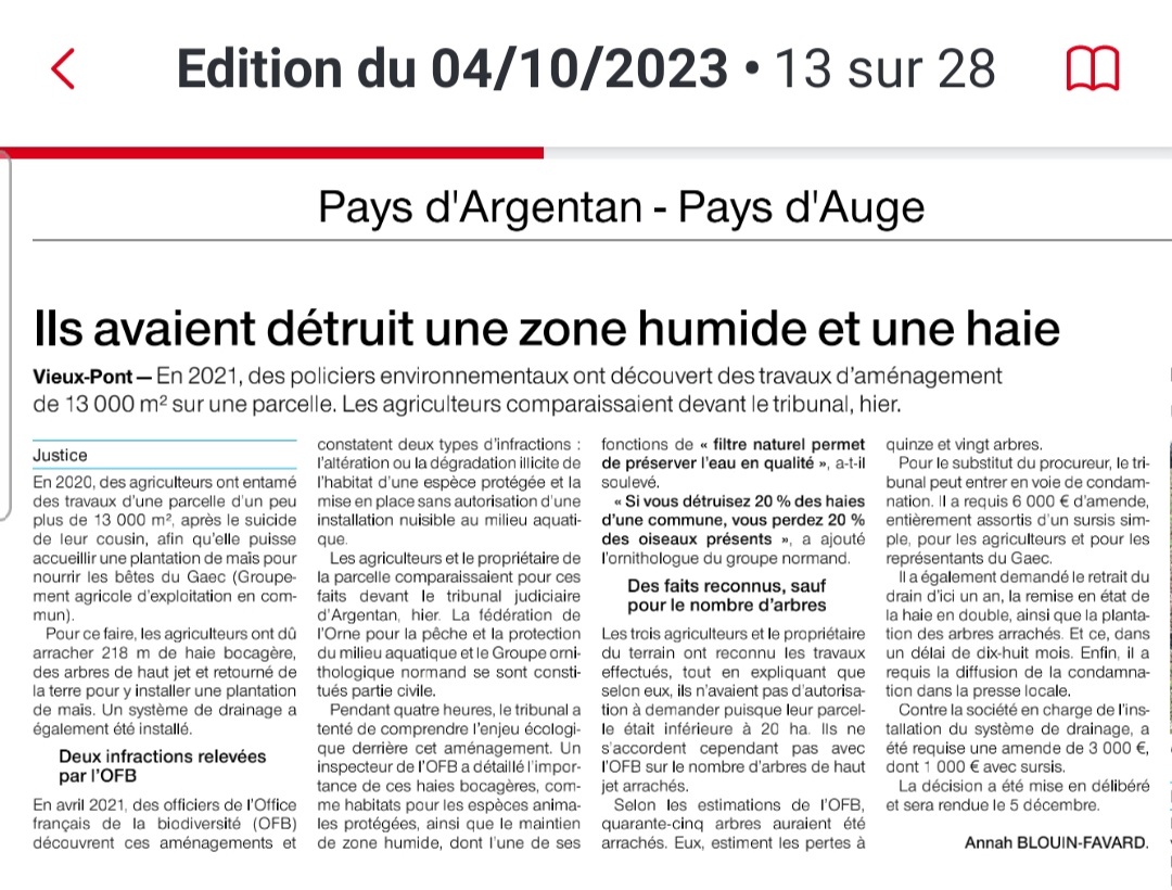 Le GONm s'est porté partie civile avec la fédération de pêche de l'Orne, pour destruction de haies et drainage en zone humide. L'affaire a été traitée par le tribunal d'Argentan/61 le 3 octobre 2023. Il y a des raisons d'espérer une décision favorable du juge.