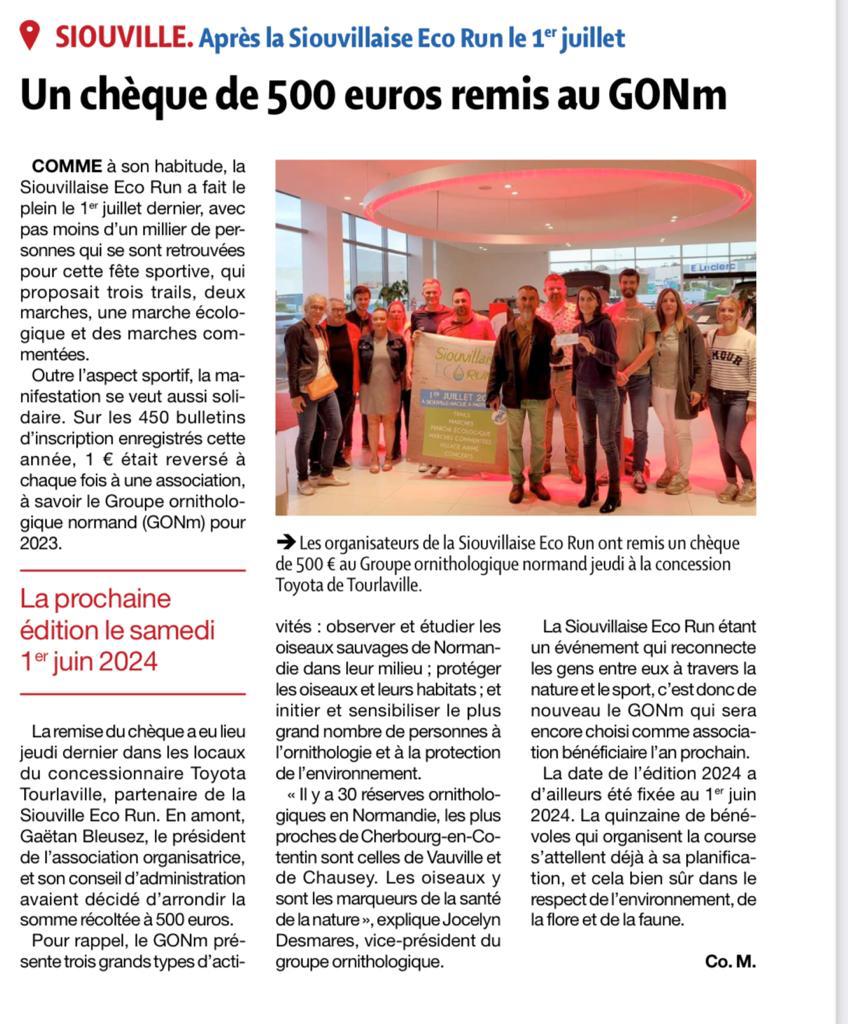 Une initiative à souligner : les organisateurs de cette épreuve sportive (La Siouvillaise Eco Run)ont réservé 1% du montant de leurs inscriptions à une association environnementale. Cette année, c'est le GONm qui a bénéficié de cette générosité. Jocelyn Desmares vice-président du GONm s'est vu remettre un chèque de 500 euros. Merci donc à "La Siouvillaise" pour cette aide très appréciable et de mettre ainsi en avant les actions du GONm.