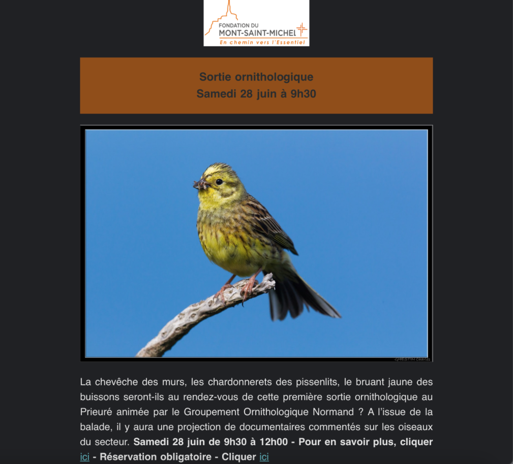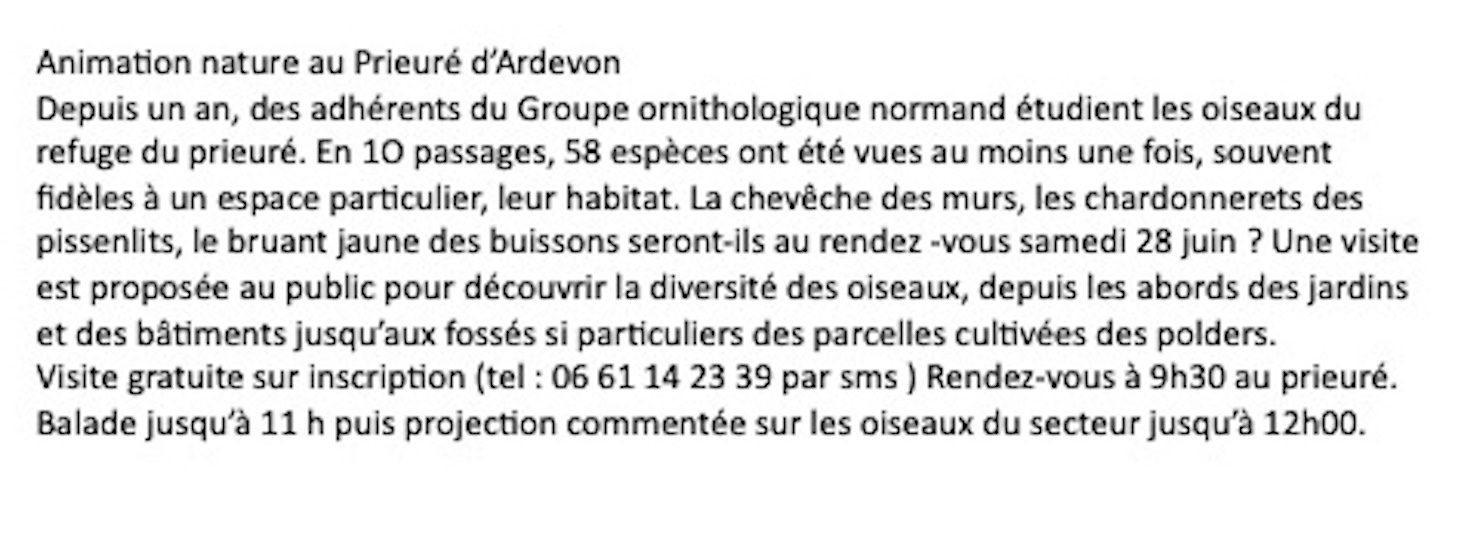 Le prieuré d'Ardevon est un des refuges du réseau du GONm. Après un an de suivi mensuel, nous avons proposé aux responsables du site une animation sur le thème des oiseaux (mais pas que). La communication (et l'inscription) est gérée par la responsable de l'association. Ce qui explique l'injonction "se munir de jumelles", condition que nous évitons de préciser en général. Ou bien le participant est déjà observateur pratiquant, et l'usage des jumelles lui est habituel, il les aura sur place; ou bien celui-ci a sorti les jumelles de l'armoire pour l'occasion et elles ne lui seront pas de grande utilité si la mise au point et la visée ne sont pas un réflexe déjà en place.