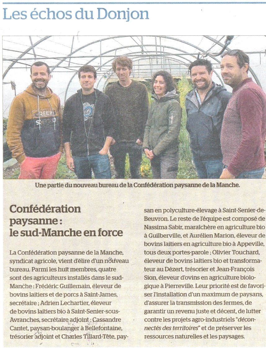 Message hors sujet si l'on s'en tient strictement à nos statuts. Pas tant que ça : sur la photo, 6 élus de la Confédération paysanne du Sud-Manche : 2 sont adhérents du GONm au titre des refuges (bio). Si 1/3 des agriculteurs normands avaient assez de sympathie pour la biodiversité au point d'adhérer au GONm, la vie serait plus belle! A tous points de vue...