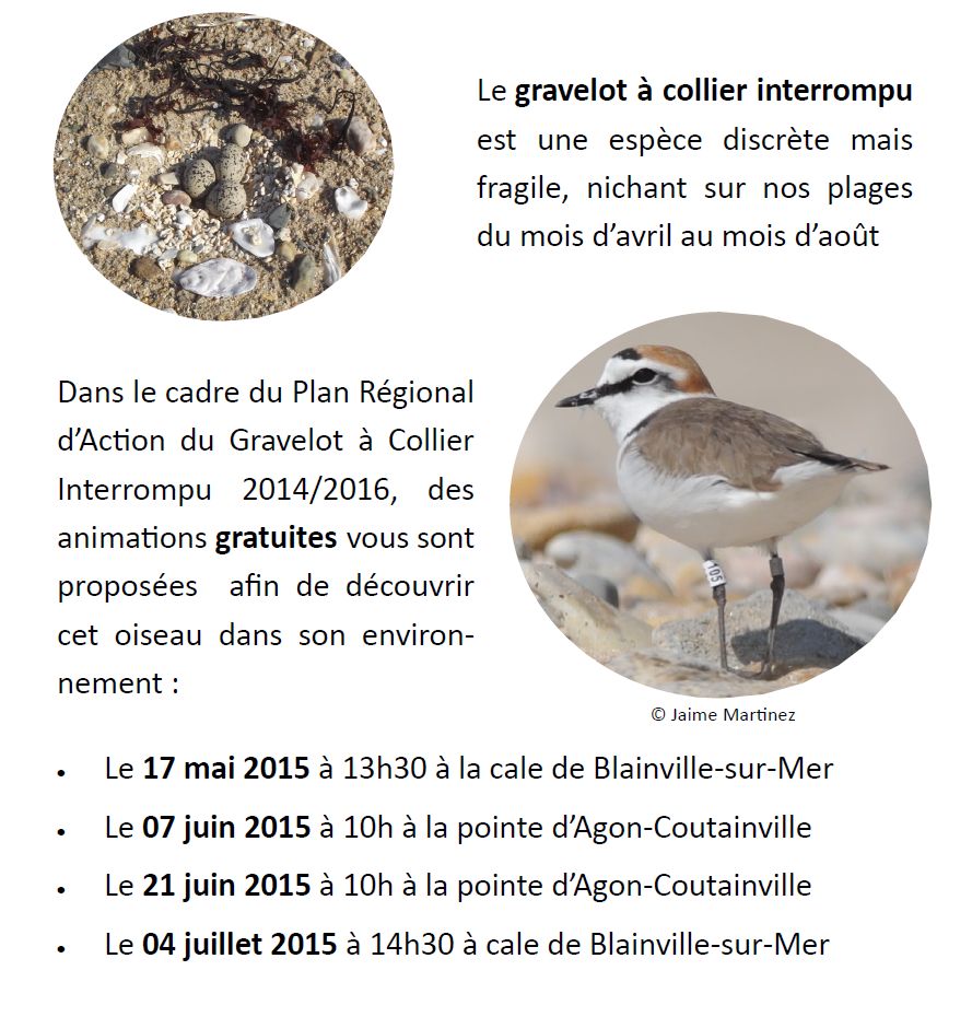 Rendez-vous à la cale de Blainville-sur-Mer Découverte gratuite d'une espèce discrète mais fragile qui niche sur nos plages d'avril à août avec Clémence Michèle. Renseignements au 02 31 43 52 56