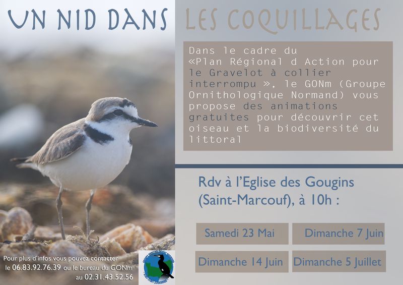Rendez-vous à l'église des Gougins. Animation gratuite dans le cadre du Plan Régional d'Action pour le gravelot à collier interrompu. Venez découvrir cette espèce. Contact : Jaime MARTINEZ tel : 06 83 92 76 39 ou 02 31 43 52 56