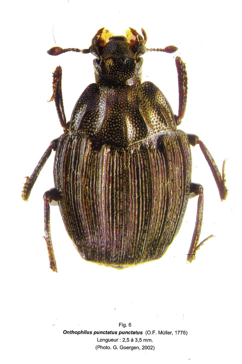 le coléoptère qui &quot;vit dans les végétaux décomposés, les excréments, les nids de taupe et de blaireau, à l'entrée des terriers de lapin&quot; d'après la littérature. <br />Longueur : 2,5 à 3,5 mm<br />(Photo. G. Goergen, 2002) dans Gomy, 2003)