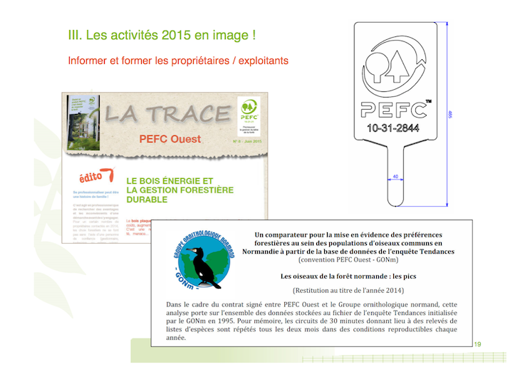 Le GONm est adhérent depuis la création de PEFC (PEFC Normandie initialement, élargi à PEFC Ouest) au titre du collège III des utilisateurs de la forêt à côté des chasseurs et d'autres structures non directement liées à l"économie du bois. Nous y représentons aussi FNE.