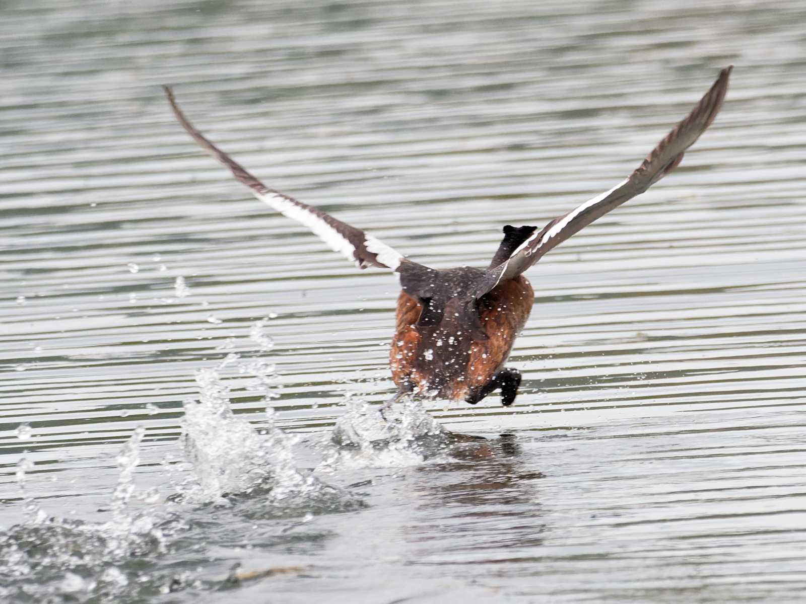 Ils étaient 12 à passer et repasser en formation serrée entre 12h et 12h30. Un passage au ras de l'étang : dans le fond, marnes grises de l'Île aux oiseaux avec Grèbe castagneux en plumage nuptial.