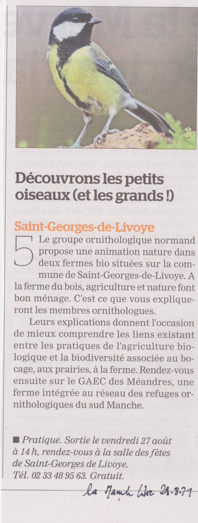 J'ai fait le test de rédiger des annonces variées pour la dernière animation à Saint-Georges-de-Livoye. L'annonce publiée par La Manche libre (pages loisirs) est un mix approximatif. Mais l'essentiel y est. J'ai reçu plusieurs coups de téléphone pour savoir s'il s'agissait d'une visite de ferme... Un groupe de 8 hérons posés sur les parcelles, un nid de guêpes gratté par le blaireau, de jeunes arbres semés par les oiseaux et le vent sous les clôtures et protégés hors broyage, les perchoirs de la buse sous les vieux arbres garnis de branches mortes sous lesquels les pelotes sont bien visibles, de même que celles de l'effraie sous les bâtiments, un groupe de gobemouches en chasse, bien actifs, les plumes de mue nombreuses, l'angle de champ en déprise, les chenilles issues des pontes de paon du jour sur les orties bien éclairées, etc, bien des motifs de plaisir! Par contre, outre le phénomène d'érosion du voisinage (la ferme des Bois de St Georges est "toute herbe"), le broyage - par le voisin- des jeunes arbres plantés par Thierry et l'arrosage débordant du débroussaillant d'un autre voisin sur ses haies sont les preuves que cette autre agriculture fait fausse route.