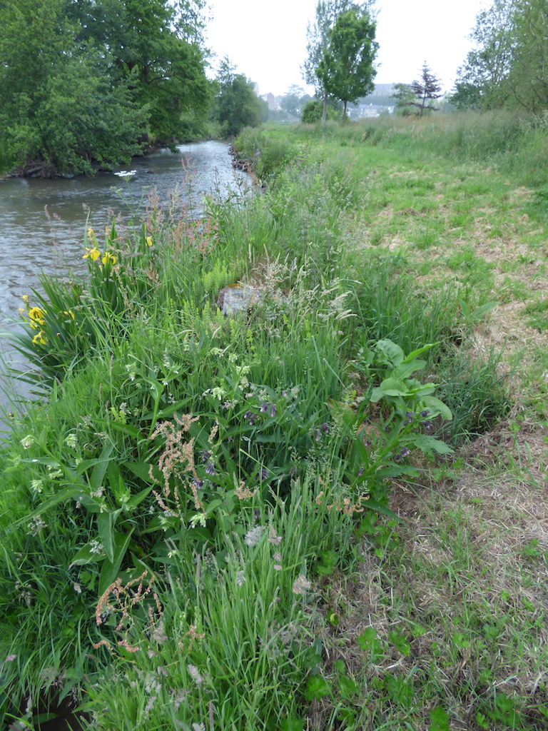 - un couple de merles affairé le long du bief : la femelle se pose derrière une grosse pierre sur la rive et s'active - je ne vois que la tête dépasser par intermittence -; elle repart à plusieurs reprises avec un paquet de vase au bec et file directement vers un buisson qui cache la nid en construction. Son comportement peu farouche m'incite à la prendre en (mauvaise) photo. Le mâle l'attaque à deux reprises, tentant probablement (?) de l'obliger à cesser ce va et vient qui dénonce son activité. - un buisson de bourdaine le long du bief accueille les chenilles du papillon Citron. Même si les entailles ne sont pas exactement symétriques dans ce cas, il y a peu de doutes sur la détermination. Le positionnement dans l'axe de la nervure principale est aussi caractéristique. Heureusement qu'il n'y a pas (?) de bourdaine horticole décorative à feuillage pourpre, les prédateurs auraient la tâche facile! C'est pourtant ce qui arrive sur les prunus, les chênes, les hêtres, les noisetiers, etc. "rouges". - pour le plaisir de la terminologie (demander l'avis des poissons aussi)... Cherchez Lee Wulf sur un moteur de recherche, le roi du hameçon sans ardillon. - Une des préconisations de gestion émises l'an dernier a été mise en oeuvre : créer un sentier le long de la rivière dans la partie non fauchée pour limiter la déambulation "erratique" des promeneurs dans la prairie. Souhait en partie exaucé, la végétation de la rive est beaucoup plus variée que celle du reste de la prairie classiquement couverte de graminées denses. Mais il va encore falloir préciser que le broyeur ne doit pas s'approcher à moins d'un mètre de la rive... - pour finir, l'énigme... Des feuilles de ronce torsadées. Qui est responsable de cette déformation?