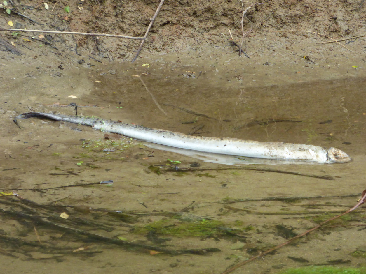 Les lamproies marines venues frayer sur les radiers de la Sée meurent chaque année. Un cadavre sur la rive au droit de la réserve du Montier a fait des heureux...