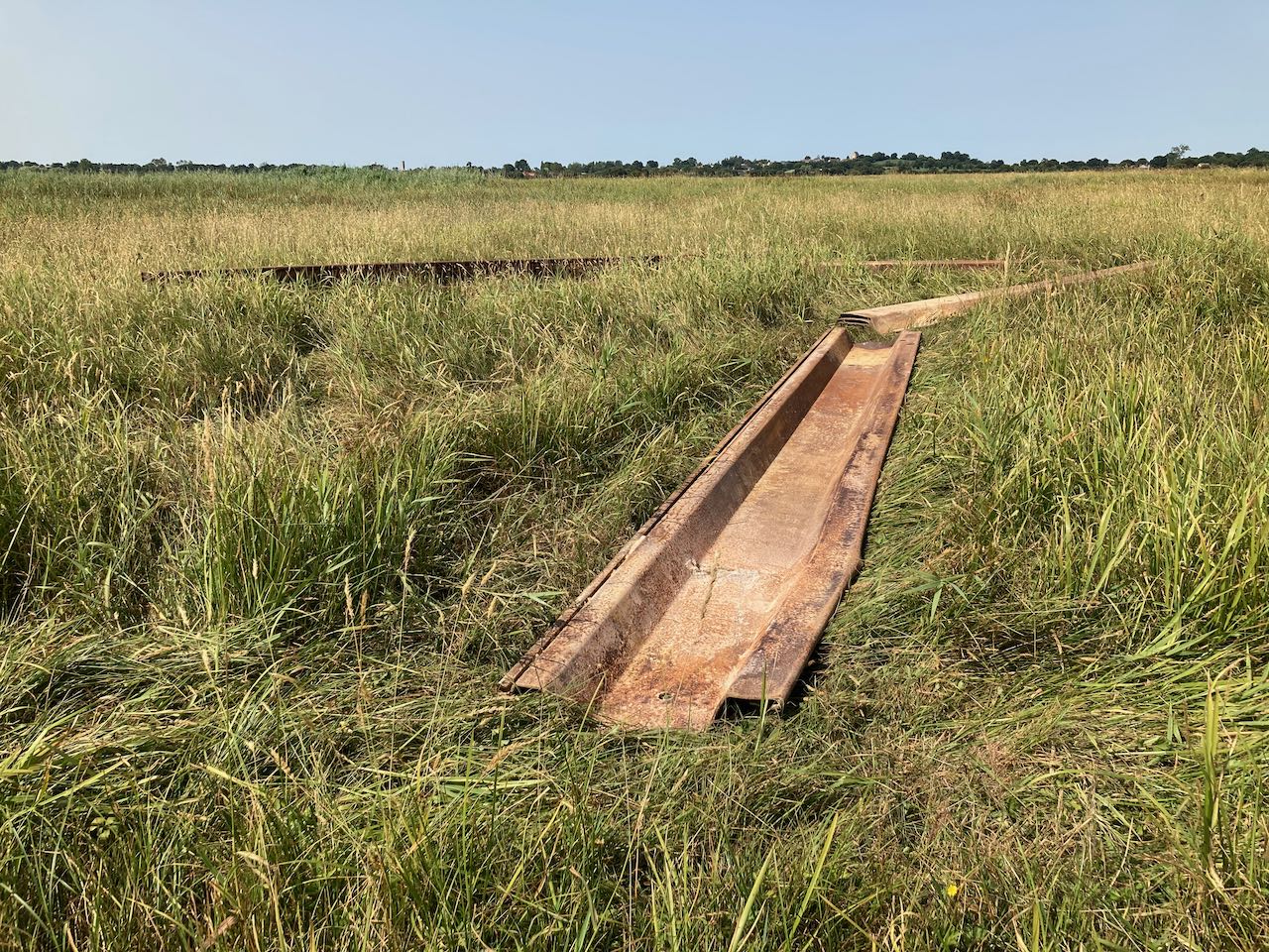 Sur la première photo ont aperçoit les troncs des cyprès, imputrescibles, qui, une fois enfouis parallèlement à chaque rive, soutiendront les culées en béton de part et d'autre de la rivière et éviteront que le tout s'enfonce dans la tourbe.