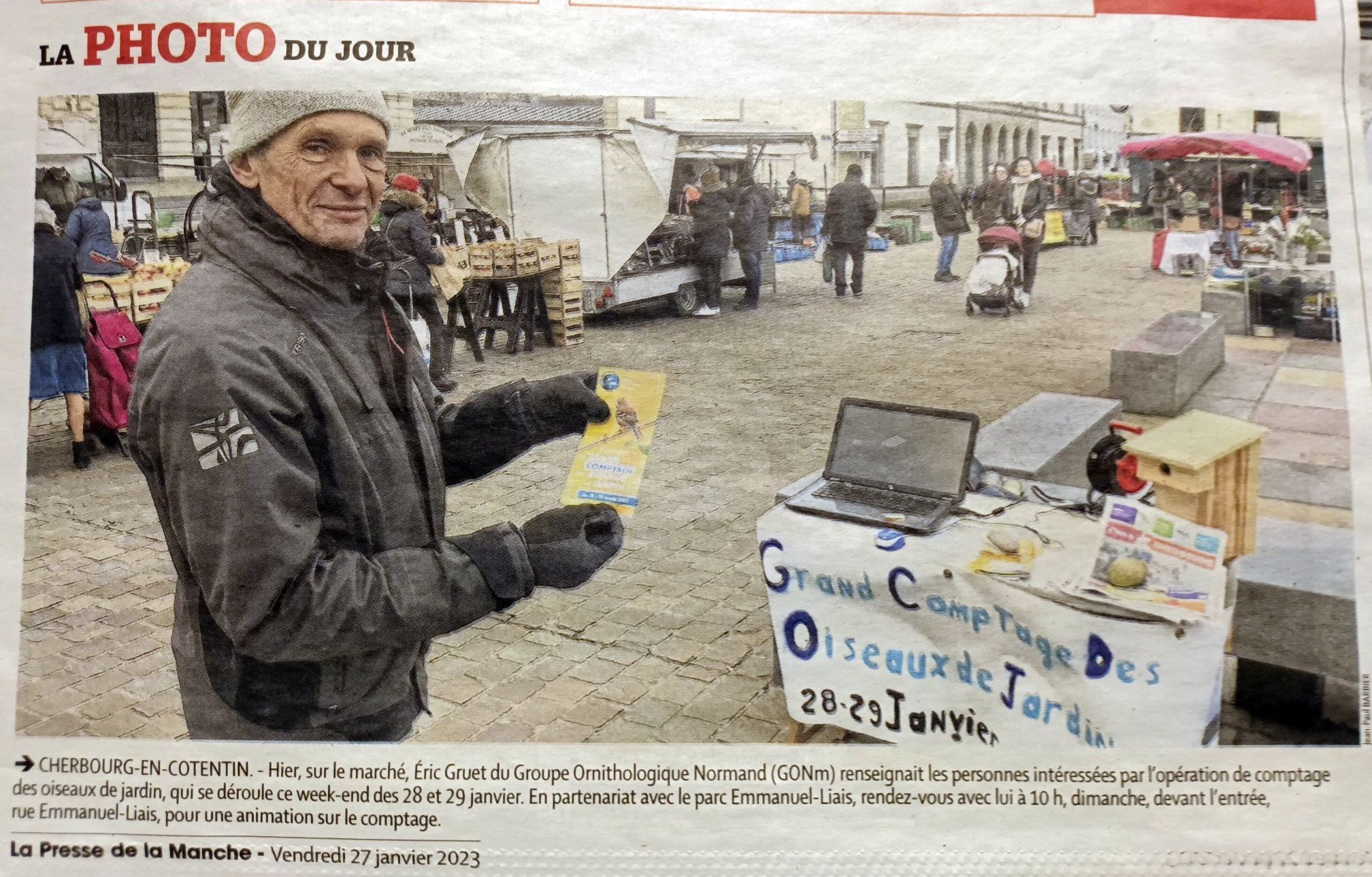 A Cherbourg où Eric Gruet du GONm a vaillamment affronté le froid du marché hebdomadaire. Article papier de la Presse de la Manche.