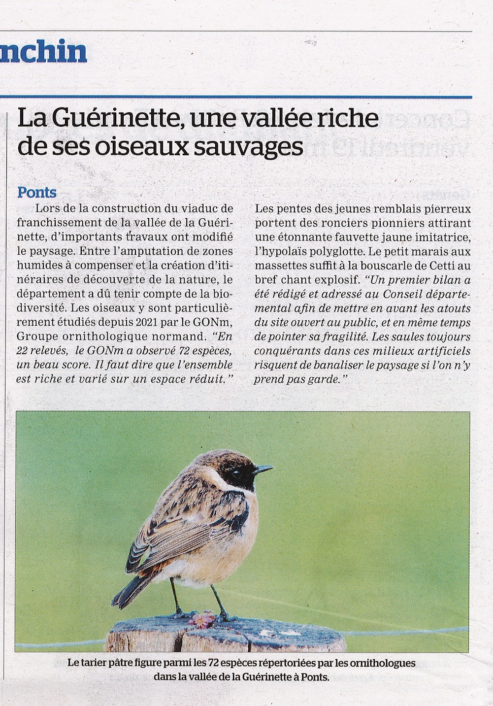 Le GONm avait participé en 2002 aux études préliminaires à la mise en place de l’AOC Poiré Domfront, le numéro 67 de la revue Le Cormoran avait même été entièrement dédié aux oiseaux du verger normand. Certaines espèces trouvent dans le vieux verger de poiriers mais aussi de pommiers, un habitat original irremplaçable : rougequeue à front blanc, sittelle torchepot, mésange nonnette, gobemouche gris, pic épeichette, chouette chevêche... Associé à la haie vive, la verger abrite les plus fortes populations de passereaux : oiseaux des buissons, des branches, des troncs creux, des écorces soulevées, des bouses (le verger haute tige inclus le pâturage de la prairie associée ; on parle d’ « agroforesterie » maintenant). L’hiver, les bandes de grives se nourrissant sur les fruits oubliés au sol sont souvent impressionnantes et la prairie naturelle de ces parcelles est recherchée par tous les picoreurs de vers et autres invertébrés.
