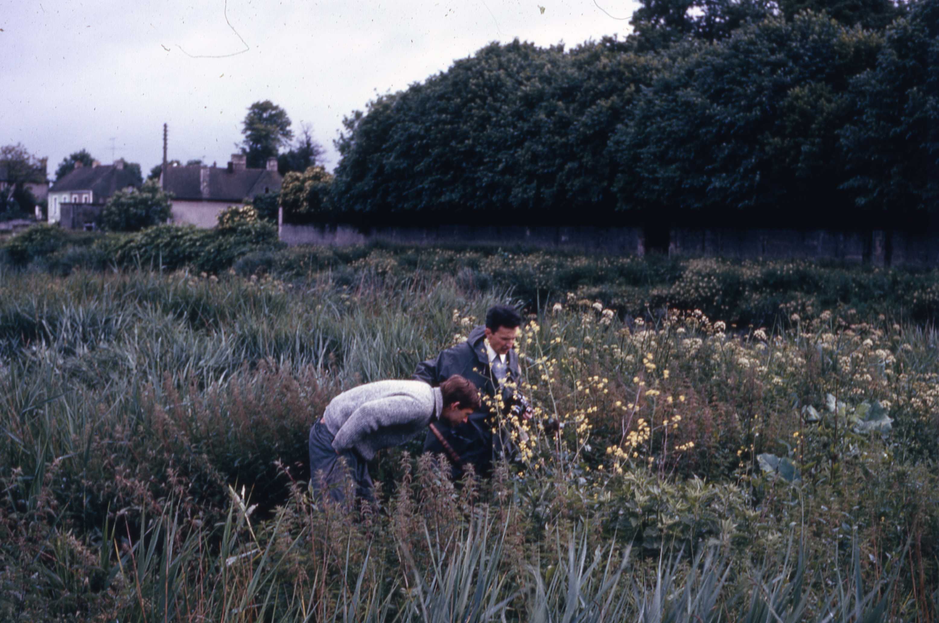 G. Moreau à la recherche des nids de rousserolle verderolle (et JCo qui profite de la leçon), rives de l'Orne, Caen. 16 juin 1971.