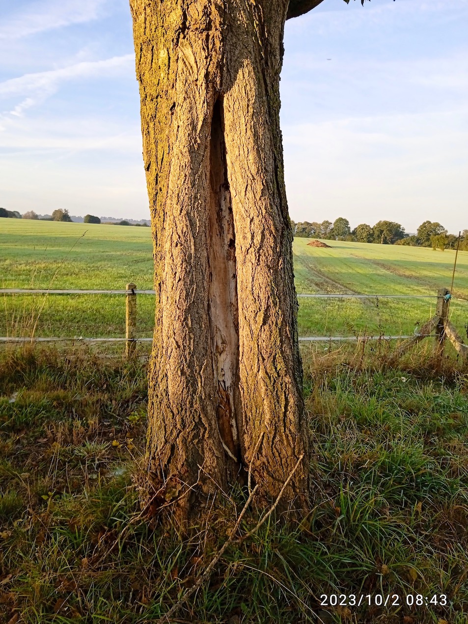 L'écorçage (sujet de l'article) engendre des plaies en fissures caractéristiques. Le bois de coeur attaqué par les champignons puis par les larves d'insectes devient une terrain de chasse pour les pics, les mésanges, la sittelle... Le tronc du pommier illustre particulièrement ce phénomène, d'une part à cause de sa vulnérabilité sous la dent du bétail, d'autre part vu la lenteur de la cicatrisation qui se traduit par les nombreuses cavités offertes par les vieux pommiers (vergers hautes tiges à défendre contre leur remplacement par les plantations intensives basses tiges!) L'article cité en début de message relève la relative rareté des nidifications à partir de ces fissures dans nos forêts, observation logique vu les pratiques d'entretien sélectif de nos forestiers. Cependant, en vieux verger, il est possible d'observer la nidification des mésanges dans cet habitat original. Le pic épeiche peut percer une seconde ouverture pour accéder aux larves et insectes du bois mort et de l'humus qui se forment dans la tronc creusé du pommier. Les pics savent reconnaitre les zones de fragilité engendrées par les écorces blessées et les creusent préférentiellement sur un tronc. Le bois de coeur attaqué à la fois par les champignons et les insectes des troncs creux constitue un habitat irremplaçable que tout refuge devrait chercher à favoriser, que ce soit un tronc mort ou mourant debout ou un tronc "en épave" couché. La rencontre au refuge de la Chauvinière (Bacilly/50) pour fêter les 20 ans de la convention ne pouvait pas mieux être immortalisée que sous le vieux cerisier amputé d'une grosse branche mais encore plein de vie sauvage. Merci à Gérard Debout pour la transmission de la référence bibliographique.