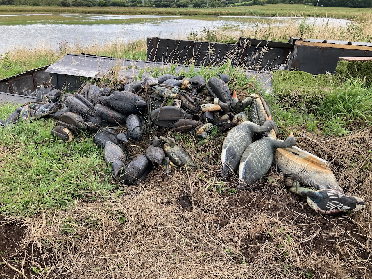 Ramassage de ± 150 formes de canards, ± 50 plateaux pour appelants vivants qui se trouvaient dans mare, sans parler des innombrables bouts de ferraille. Ce n'est qu'un début, le travaux de remise en état ne pourront avoir lieu que lorsque nous aurons l'aval de la DDTM.