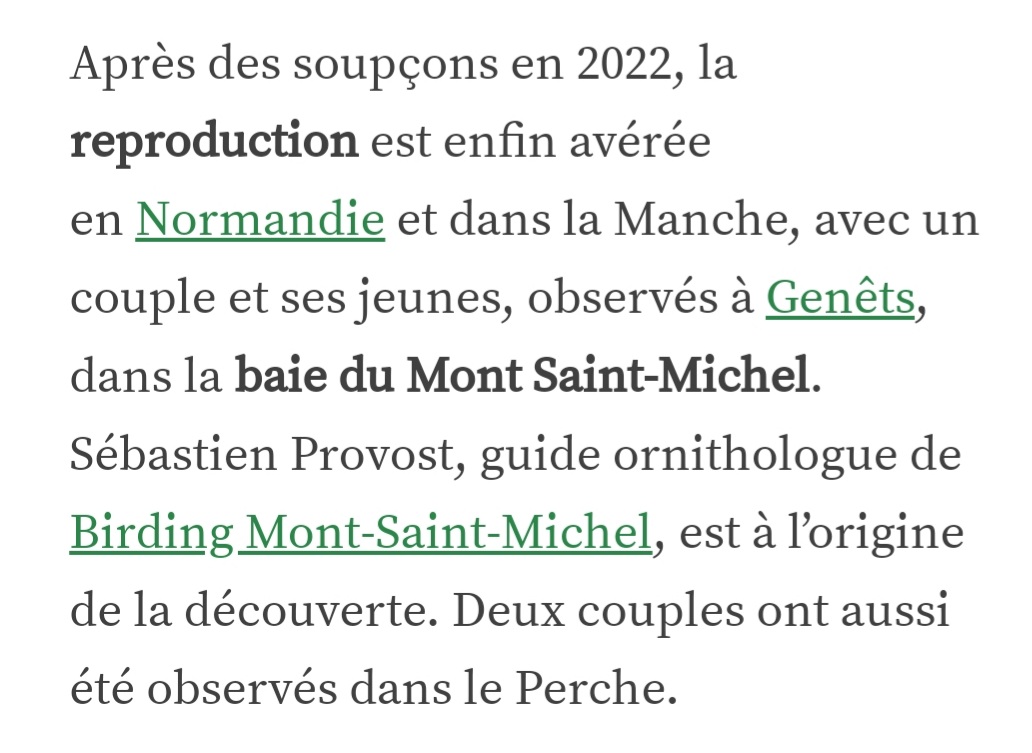 Un couple a niché dans la baie du Mont-Saint-Michel et a produit 3 jeunes. C'est une première, pour la baie du Mont-Saint-Michel, découverte par Sébastien Provost. D'autres nidifications sont aussi connue cette année , dans l'Orne et dans la Manche : cela montre la poussée très nette de l'espèce vers le nord.