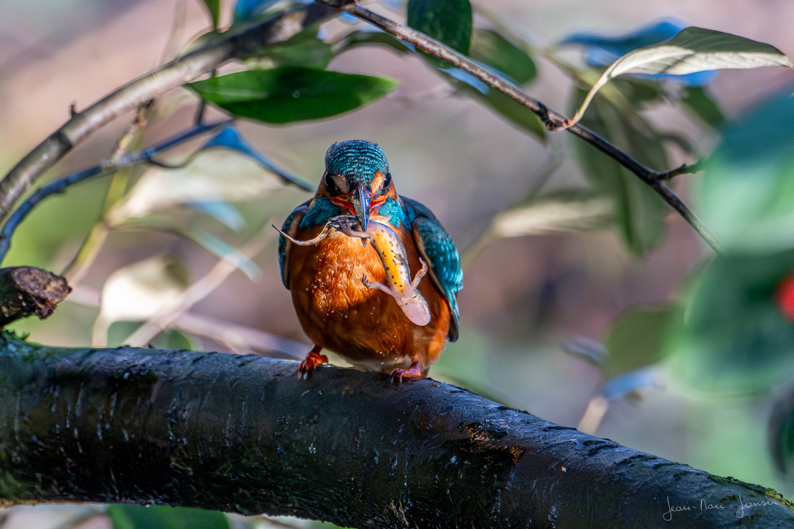 Le premier triton revenu dans la mare refaite à neuf, contrôlé grâce à l'épuisette le 30/12/23, était un mâle de triton palmé. Jusque là le martin-pêcheur venait irrégulièrement et n'avait pas grand chose à trouver. La première capture d'un triton sp. par la femelle de martin-pêcheur a eu lieu le 4/1/24, puis 2 le 5/1 (1 sp. et 1 femelle de triton palmé), preuve que la re-colonisation se fait normalement après une année blanche où la mare, à sec, n'était plus occupée. Aujourd'hui, à l'épuisette, 9 tritons contrôlés (8 palmés et un mâle d'alpestre). À eux d'être prudents face à la furie qui sévit dans le secteur.