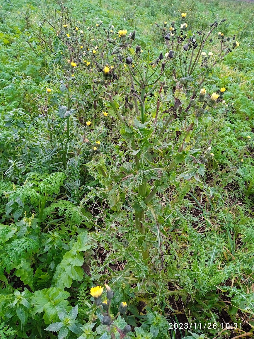 Cette carrière de roche dure (cornéenne) est visitée quatre fois par an. Les parties en cours d'exploitation sont pauvres en contacts, le caractère purement minéral et en permanente évolution étant logiquement très inhospitalier; de même les zones en eau sont très pauvres en matière organique et peu recherchées par les oiseaux. Les anciens fronts de taille et les déblais sont plus riches, étant essentiellement colonisés par les ajoncs et les bouleaux. D'autre part, une parcelle en attente d'exploitation cultivée par un agriculteur apporte un autre habitat intéressant au refuge. La visite 47 du 7 janvier 2024 est typique de la fréquentation hivernale : les ajoncs sont délaissés par les linottes et bruants hors de la saison de nidification, même l'accenteur est discret. Les massifs de bouleaux sont parcourus par les mésanges (surtout charbonnière lors du relevé) et les pinsons des arbres. Les données sont condensées en un bref bilan mis en attente de la rédaction de la synthèse triennale. La parcelle agricole "haute" (entre 200 et 175 m) a porté une culture de blé cet été. Elle est actuellement semée d'un couvert destiné à bloquer l'érosion et le lessivage des reliquats d'engrais ("CIPAN" = culture intermédiaire piège à nitrates) : par dessus les germination de blé (grains échappés de la moisson tardive pour cause de météo estivale pluvieuse), de la phacélie et des "navets" ont été semés avec une densité assez faible pour que la flore spontanée trouve sa place. Un mélange de messicoles et d'adventices a germé, fleuri et porte des graines dès la mi novembre. C'est là que stationne un petit groupe d'alouettes, linottes, pipits et musiciennes. Ces dernières ont déjà été notées sur un autre refuge (Lolif/50) sous le couvert de la moutarde semée en couvre sol. D'autres adventices se sont installées ou ont développé des organes aériens, et portent déjà des fleurs ou des graines : rumex, millepertuis, morelle noire, etc.