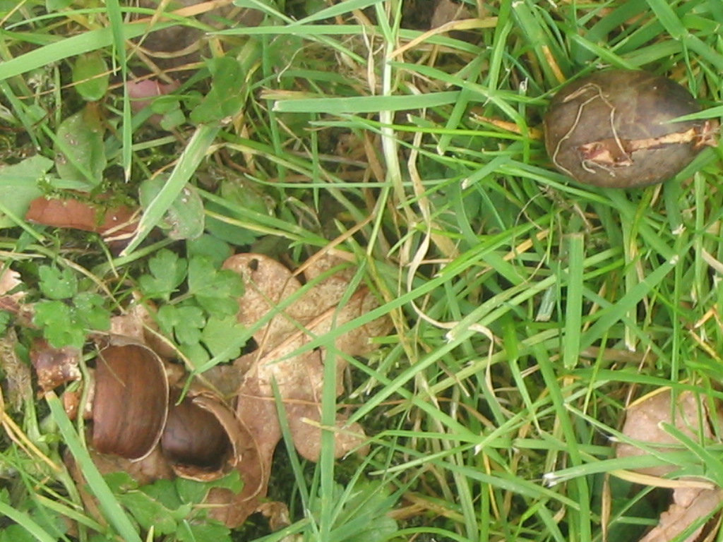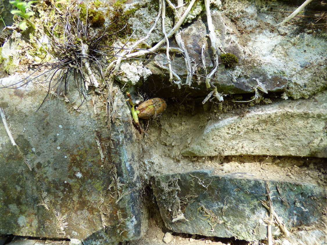 Sur place, pas grand chose à voir : les brins de mousse arrachés et un léger trou dans la mousse : une plantule en place, ce qui signifie que le geai n'a pas arraché tout le gland et sa plantule, mais seulement un cotylédon. Cette dernière remarque est hypothétique : il est bien reparti avec une "masse" de la taille d'un cotylédon de chêne sans que je ne puisse le vérifier! Le geai invente d'autres cachettes : il sait enfoncer des glands dans les anfractuosités des murs de pierre au Montier (qu'il faut supprimer au risque de transformer le mur en bosquet!) Autre amateur de glands, sans constitution de cachette enfouie, le pigeon ramier sait frotter les glands ramollis par l'hiver sur l'herbe pour éliminer l'enveloppe et consomme ainsi uniquement les cotylédons.