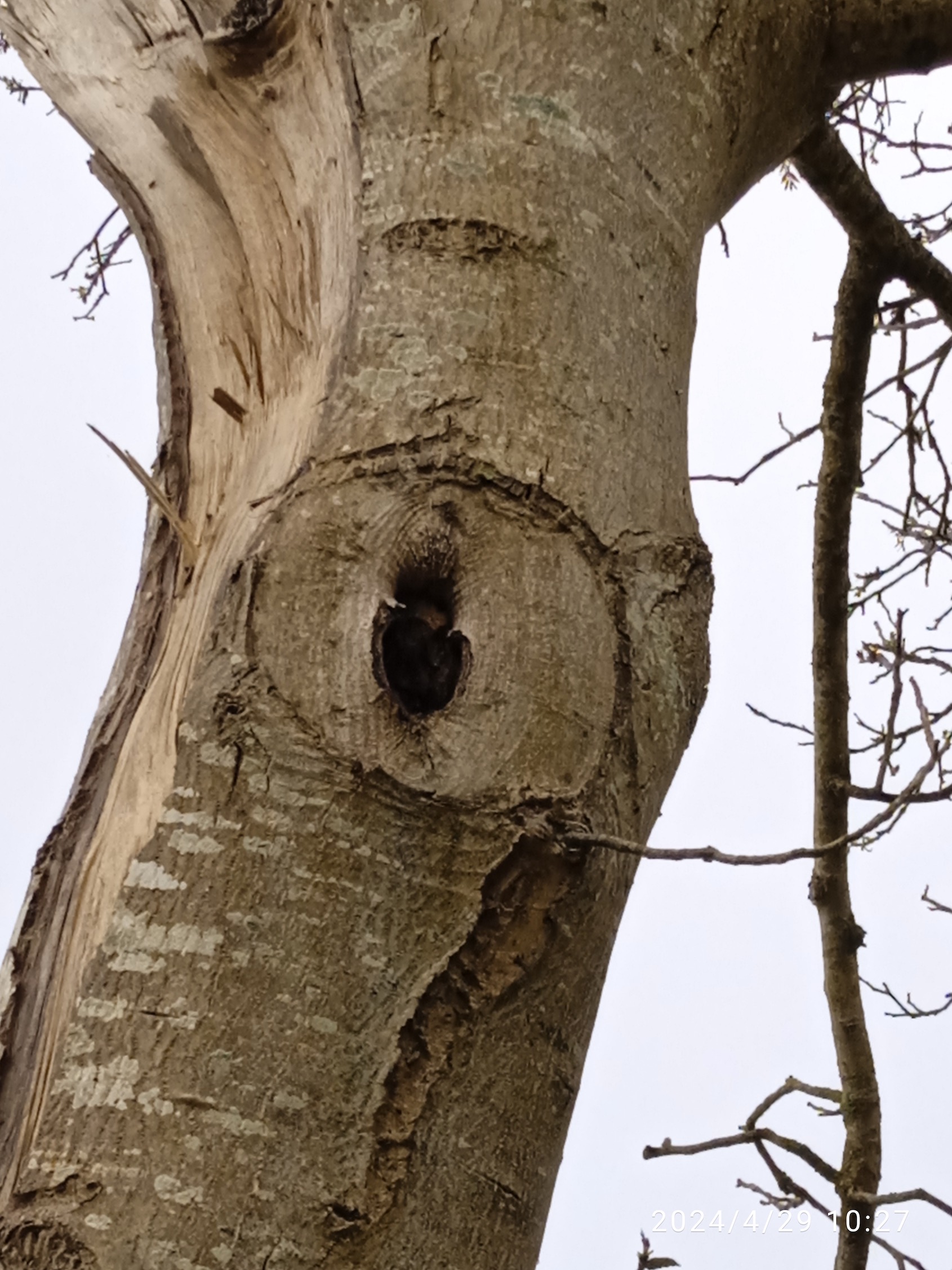 Son verger d'arbres fruitiers est fermé de haies basses et hautes (dont une qu'il vient d'acheter pour la mettre à l'abri des "aménagements" agricoles qui font fureur actuellement dans notre secteur...). Le rougequeue à front blanc chante chez le voisin (beaux bâtiments à murs de pierre, gîte assuré pour le nid) et la bouscarle se manifeste en bas dans la prairie en déprise le long du ruisseau. Une partie des fruitiers est ancienne et porte diverses plaies comme le montrent quelques photos. Les cavités sont largement disponibles. Pierre a construit 3 nichoirs posés dans le verger. Tous occupés ce mardi 30 avril, mésanges bleues et charbonnière. Au passage, on vérifie que les oiseaux ne sont pas gênés par la couleur rouge, mais aussi que le nichoir artificiel attire plus que la cavité naturelle quand le choix est offert aux mésanges... Mais le raisonnement ne vaut pas pour les invertébrés de l'humus au fond des cavités des arbres creux. Un vieux noyer a aussi connu des vicissitudes...