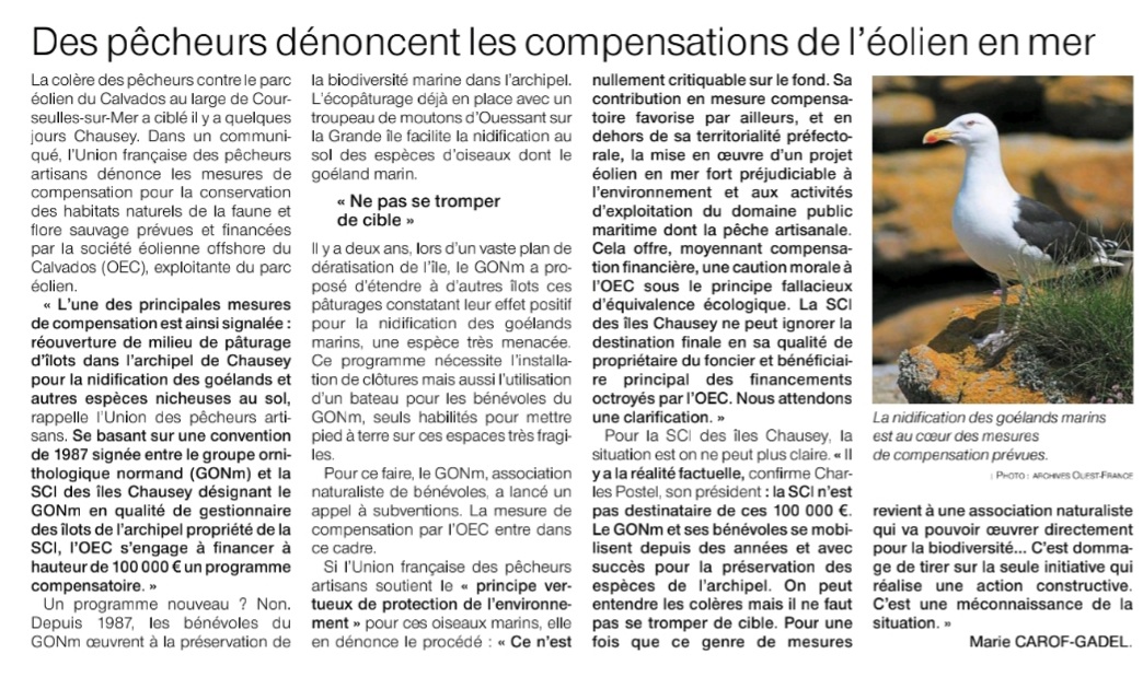 La Société civile immobilière (SCI) des Îles Chausey, propriétaire des quatre cinquièmes de l'archipel et le groupe ornithologique normand (GONm) livrent une réaction à la suite du communiqué de l'union française des pêcheurs artisans (notre édition du 6 avril). Les professionnels de la pêche s'indignaient des mesures mises en place pour compenser la destruction d'espèces protégées, dans le cadre du projet de parc éolien au large de Courseulles. L'une des mesures prévoyant de développer l'éco-pâturage pour favoriser la reproduction des goélands à Chausey.