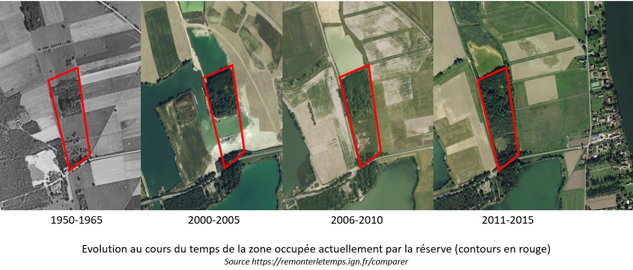 Historiquement, cette zone était une ancienne carrière d’exploitation des alluvions qui a été creusée dans les années 1970. L’exploitation a cessé au début des années 2000 et l’ensemble de la zone a été progressivement rebouché. En 2010, seul un petit étang communal était maintenu en eau au nord de la réserve, le reste a été comblé par les résidus de l’exploitation mais pas complètement, ainsi elle constitue une dépression de profondeur variable, profondeur qui s’accroît vers le nord pour atteindre au maximum 2 mètres de profondeur par rapport aux champs qui la bordent. Ainsi le bois est soumis aux variations de niveau de la nappe phréatique et peut se retrouver inondé en hiver. Cela explique que les arbres qui s’y développent, comme les aulnes et les saules, présentent des adaptations leur permettant de supporter ces périodes d’inondation. évolution de la zone au cours du temps