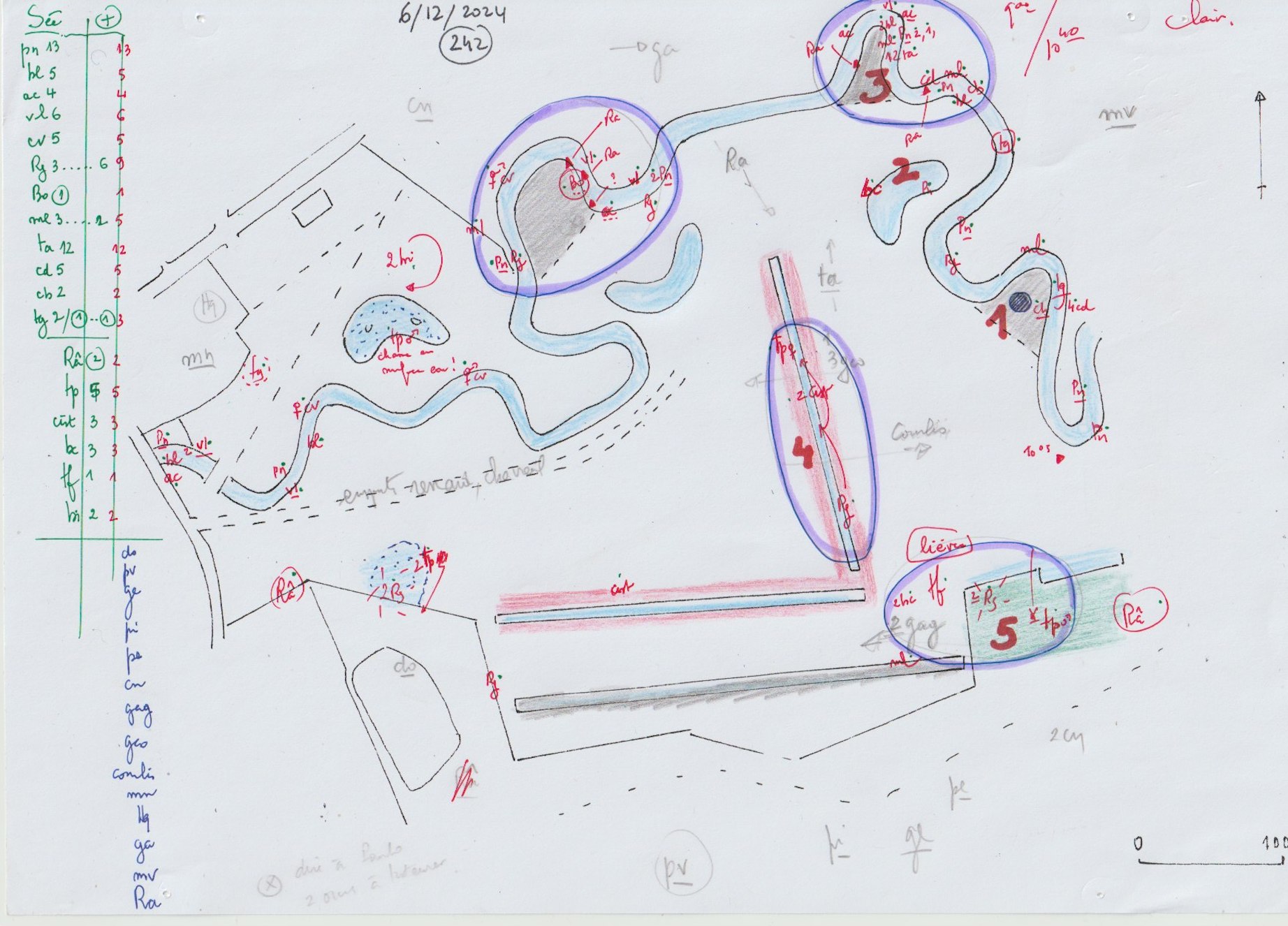 Chaque sortie se traduit par un relevé cartographié des observations, document papier "à l'ancienne" qui participera à la rédaction des synthèses annuelles. Les effectifs par espèce (à gauche en vert) sur les rives de la Sée et sur le reste de la réserve (+) sont séparés. Les observations hors réserve en bleu sur la colonne de gauche (alentours et en vol haut) valent "0" dans le tableau mais la carte conserve la mémoire des effectifs passants. Ce tas de souches n'est pas mort! Non seulement le troglodyte l'a inclus dans son territoire, mais de nombreuses autres espèces vivantes utilisent cet habitat. Des gratteurs de proies viennent y chasser, et surtout des champignons "mangeurs de bois mort" sont bien présents.