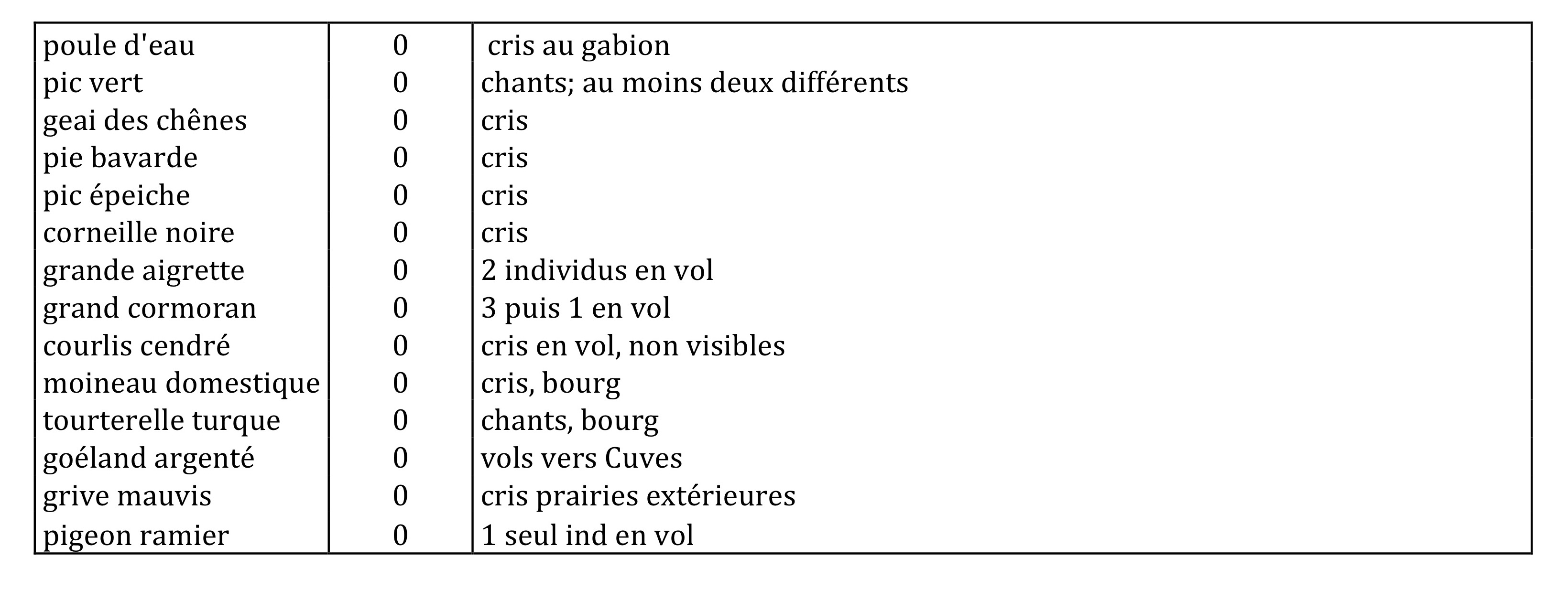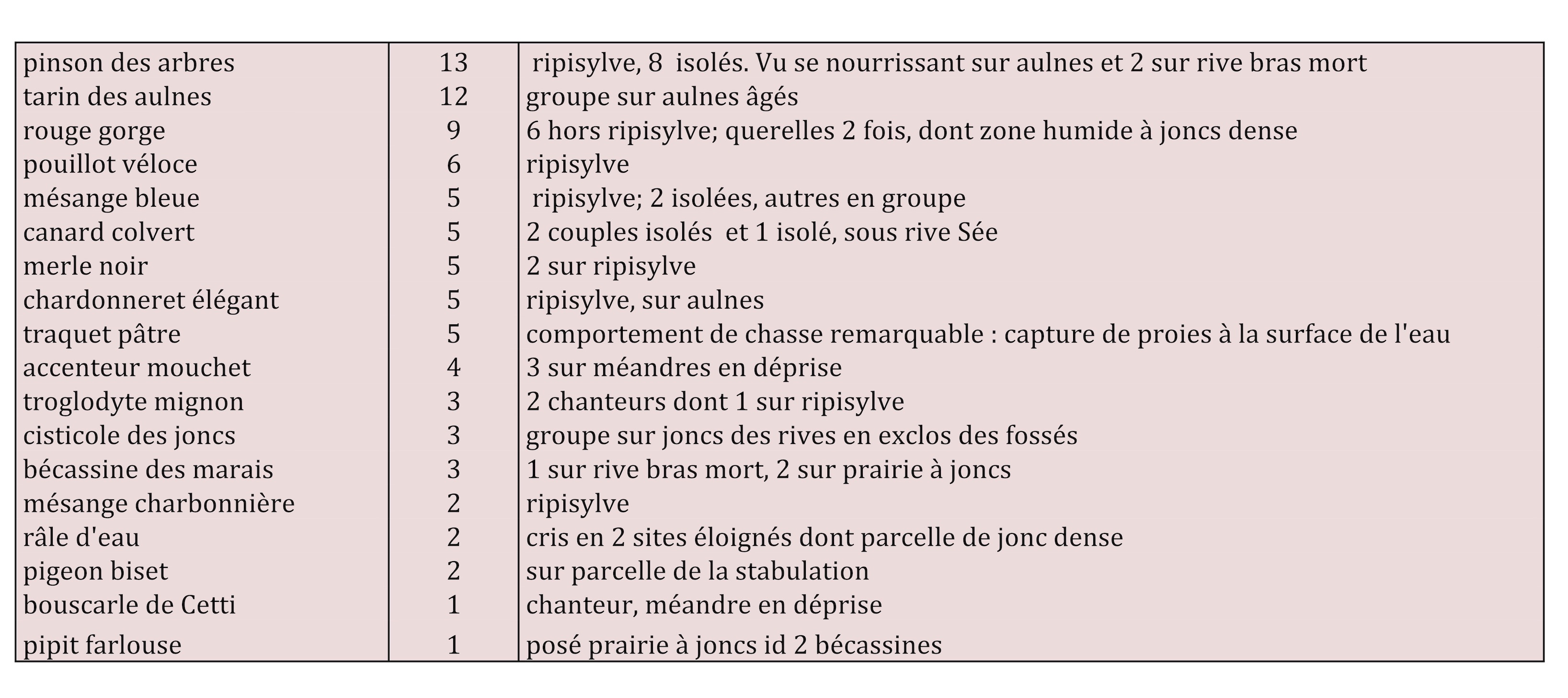 Les querelles de rouge gorge sont répétées en aval au contact d'une zone inondée, de même qu'un couple de traquet pâtre chasse au sol au contact de cette grande flaque. Plus démonstratif encore, sur le bras mort aval, un traquet pâtre mâle perché sur les piquets de clôture, s'envole vers le centre de la masse d'eau, picore une proie en vol en surface et revient se poser au point de départ, comportement répété à plusieurs reprises.