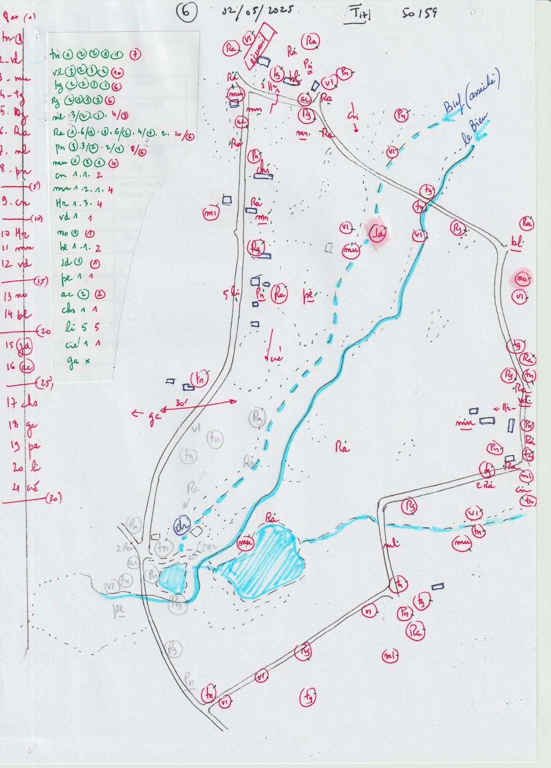 Le plan utilisé lors du relevé : Tendances, c'est d'abord une liste ordonnée par tranches de 5 min. (ici à gauche sur la feuille). Mais ça peut aussi déborder sur d'autres pratiques qui enrichissent le fichier Faune Normandie en "comptant" les contacts notés sur un plan vierge au cours du déplacement.
