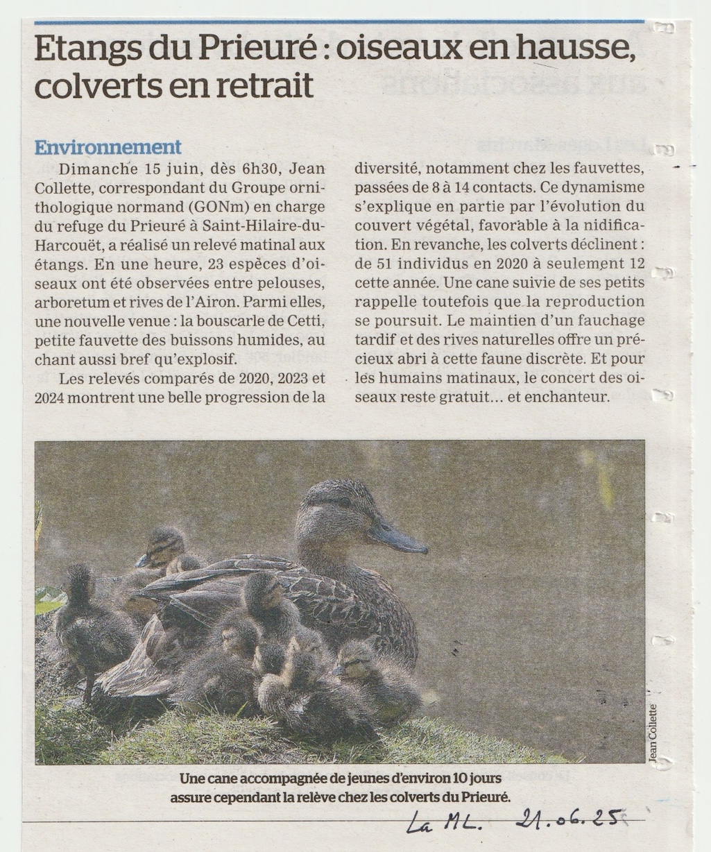 Les résultats d'une visite au refuge des étangs du prieuré sont le prétexte à un article. Le texte envoyé aux 3 titres locaux est repris et adapté par le journaliste. L'occasion surtout de noter avec satisfaction que l'entretien des rives devient plus réfléchi; quand c'est bien, faut le dire!