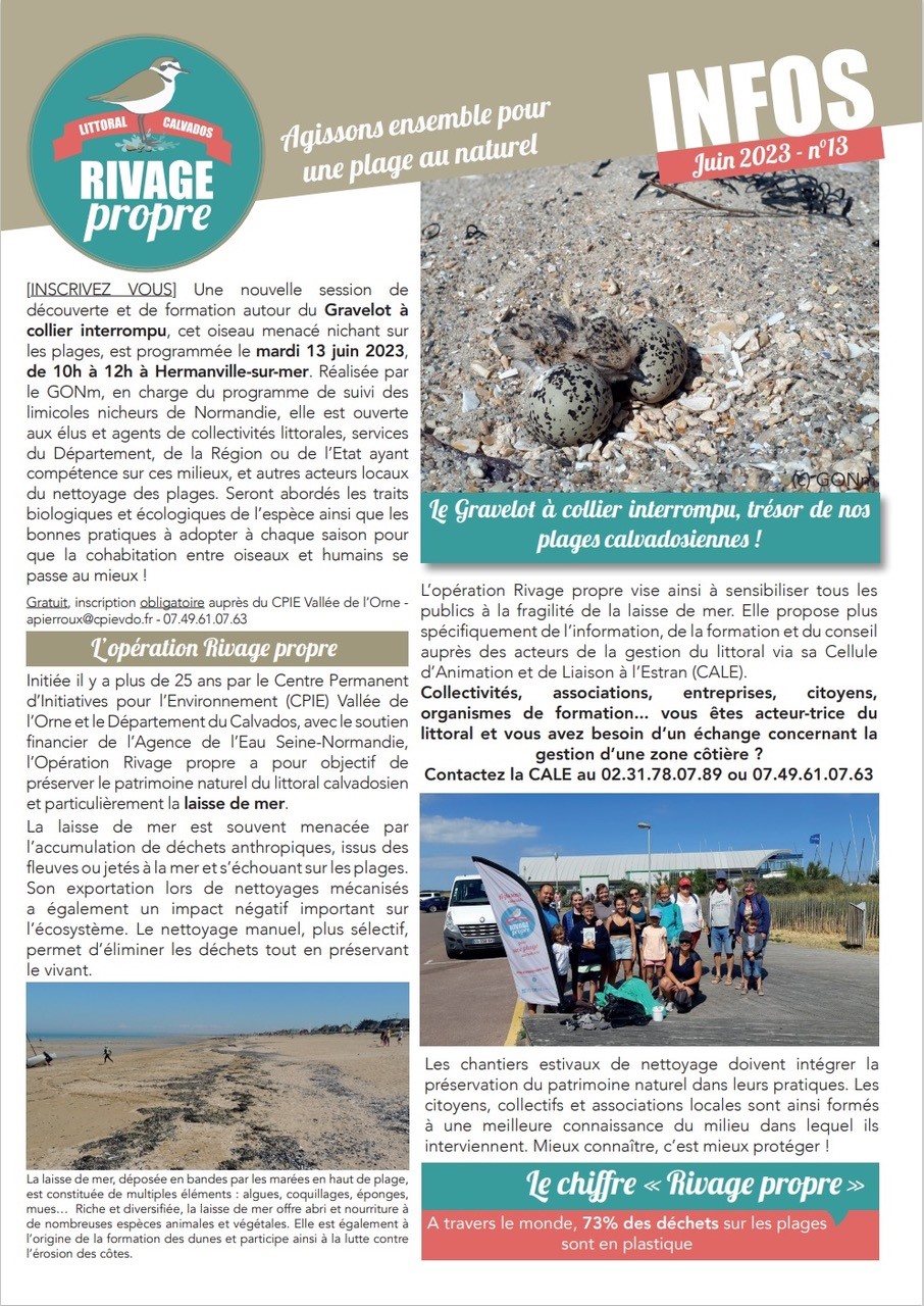 Le GONm animera une formation sur les nicheurs de haut de plage et surtout le gravelot à collier interrompu, le 13 juin 2023 à Hermanville-sur-Mer/14. Cela est dit dans le bulletin "Rivage propre" Calvados.