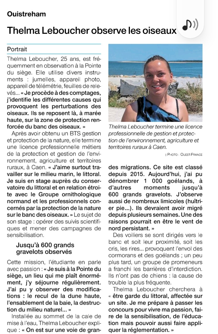 En plus d'étudier les dérangements susceptibles de concerner les oiseaux sur le banc des oiseaux, Thelma Leboucher, stagiaire au conservatoire du littoral encadrée par le GONm nous présente le contenu de son stage et propose pendant tout l'été des animations pour informer les promeneurs et usagers de la zone sur les règles à respecter pour éviter tout dérangement.