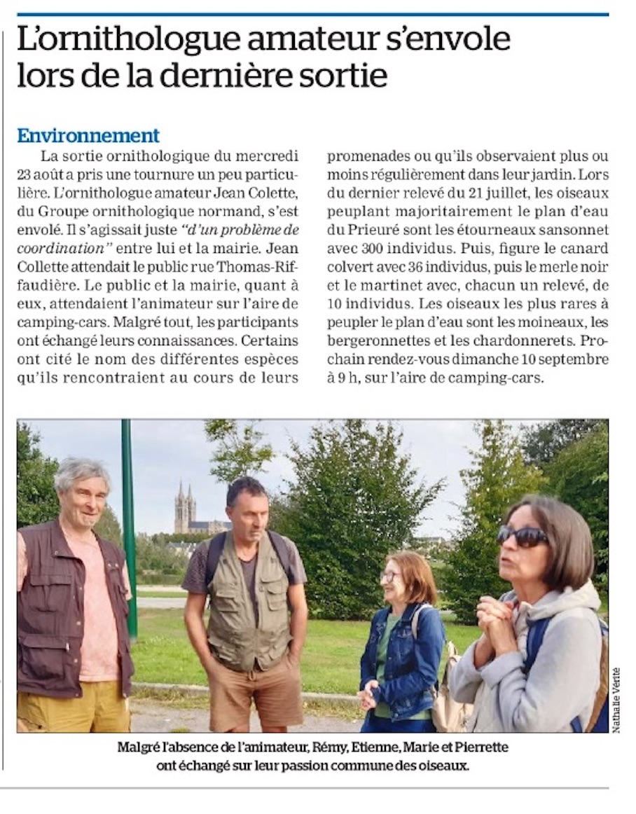 La mairie de St Hilaire-du-Harcouët a demandé deux animations (gratuites) au GONm au cours de l'été 2023 sur le thème de la nature au refuge des étangs du prieuré. Le 13 mai, RAS, 13 personnes au rendez-vous rue Riffaudière. Le 23 août, ... personne. En fait, les participants attendent sur un autre endroit, guidés par la responsable de la mairie. Non contacté, je suis reparti, ignorant la méprise. Je n'ai été averti que par l'un des participants, adhérent du GONm au cours de la journée. Deux correspondants de presse étaient présents dont celui de la Manche libre qui a rédigé un article dont le titre me rend responsable de la bavure. J'avais repris contact dès le lundi avec ces deux journaux pour expliquer la situation. Et j'ai proposé de "remplacer" ce rendez-vous manqué par une autre date, le 10 septembre. Moralité : rien ne vaut l'autonomie dans l'organisation.
