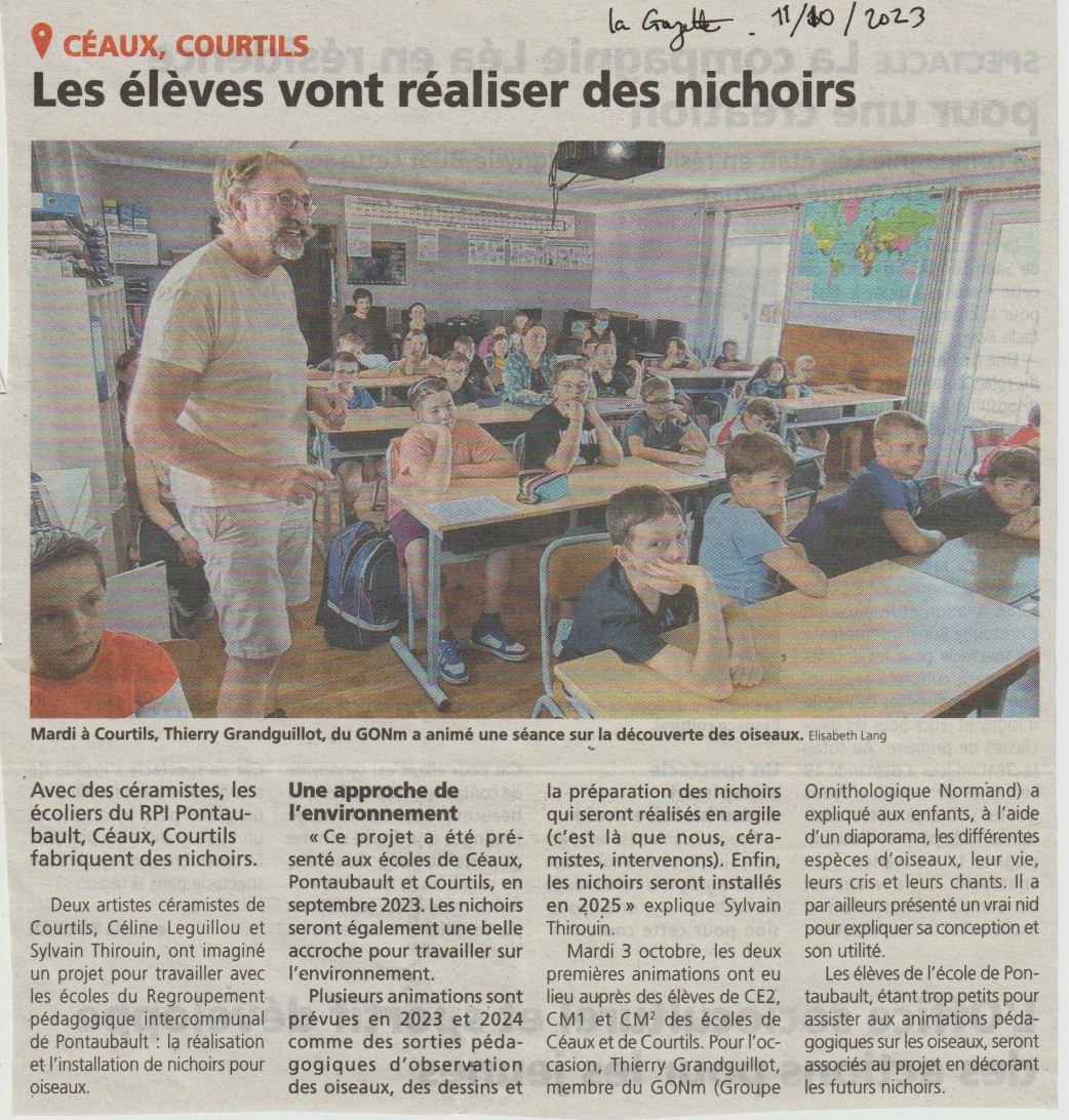 Un artiste potier, Sylvain Thirouin, nous avait proposé de participer à une action en classe pour compléter un projet d'action artistique autour du nichoir en terre sur les classes primaires de Céaux-Courtils-Pontaubault. Notre collègue Thierry Grandguillot a rempli le contrat en intervenant en classe sur le sujet des oiseaux nicheurs des cavités. De même, Xavier Niedergang dont les magnifiques clichés ont été exposés à Carolles au WE de la migration, a participé à travers ses photos.