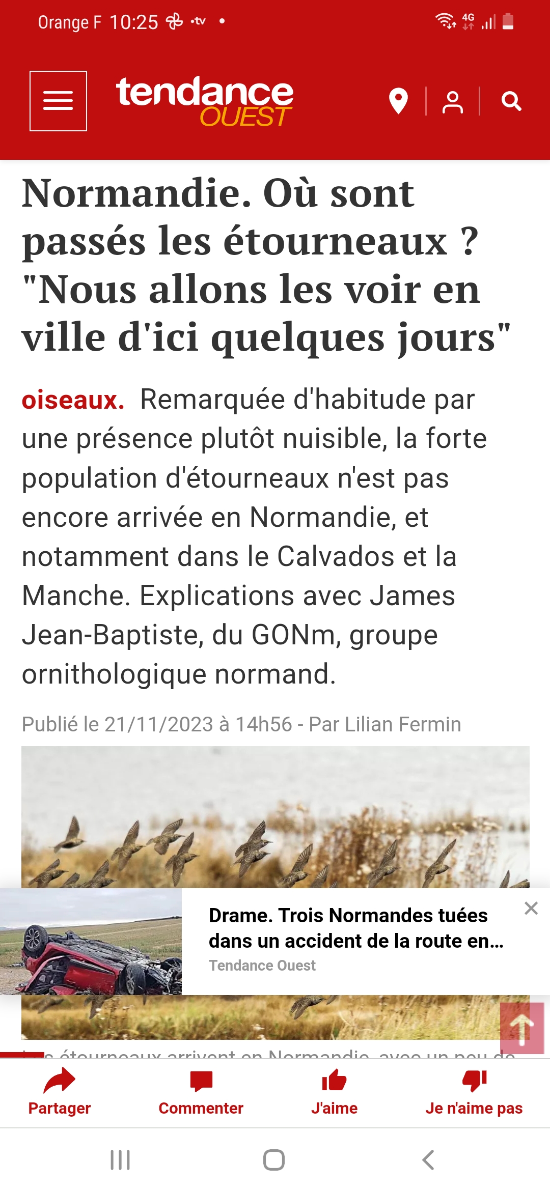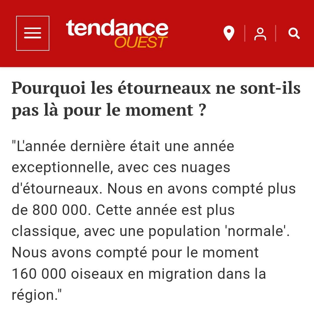 Les étourneaux sont bien là, avec notamment un très important dortoir dans le quartier Saint-Paul (jardin public et école) et aussi le spectacle de la murmuration au-dessus du port de Caen à la tombée de la nuit. Remarquez le terme "nuisible" utilisé à la légère. Hélas l'article est en petits morceaux découpés à la cisaille numérique. Qui le retrouvera complet?