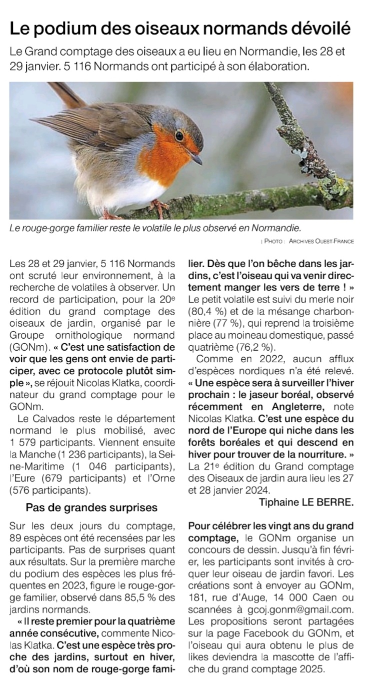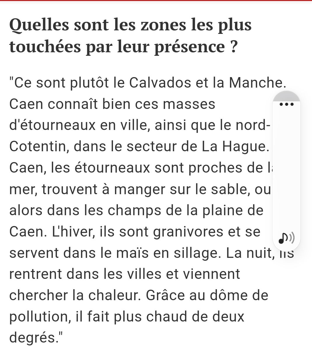 Les étourneaux sont bien là, avec notamment un très important dortoir dans le quartier Saint-Paul (jardin public et école) et aussi le spectacle de la murmuration au-dessus du port de Caen à la tombée de la nuit. Remarquez le terme "nuisible" utilisé à la légère. Hélas l'article est en petits morceaux découpés à la cisaille numérique. Qui le retrouvera complet?