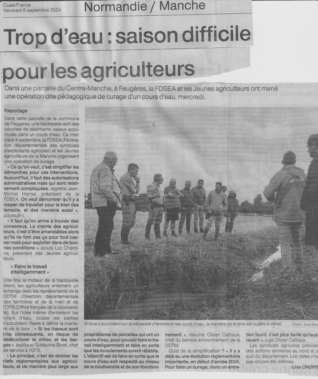 Une autre version de la rencontre rapportée plus haut (message 1344) entre syndicalistes FDSEA 50 et DDTM à propos des limites du curage des ruisseaux. CR un peu plus précis techniquement, du coup moins consensuel... Le "nez tatillon et procédurier" de l'administration se traduit dans le titre par le terme "paperasse". Nulle part il est question de la vision à long terme de la place de l'eau dans l'économie future, pas seulement à l'échelle de l'exploitation agricole. La disponibilité de volumes d'eau douce à destination du bétail, des humains, de l'industrie locale, etc, pourrait entrer dans un raisonnement plus large. Un texte extrait de Tourbières infos n°133, septembre 2024 Une dernière version de l'expérience de confrontation sur le terrain dans le Sud-Manche. On remarquera que le représentant de la DDTM confond cours d'eau et fossé, ce qui n'est pas fait pour clarifier les échanges...