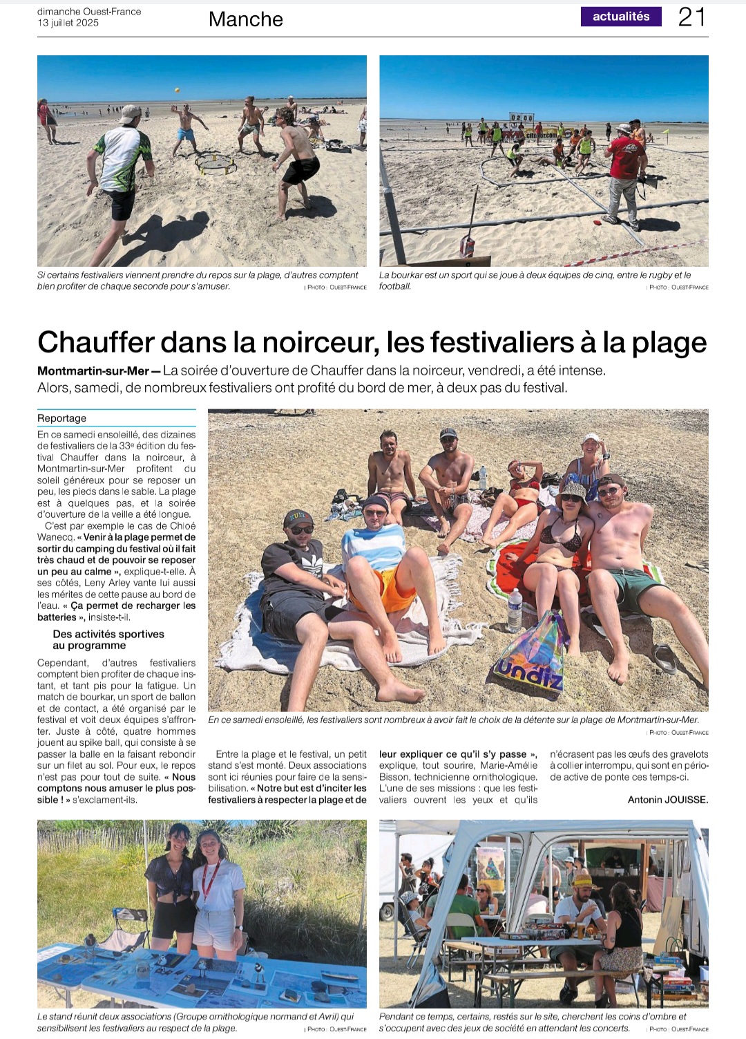 Le GONm était présent avec le CPIE sur le festival de musique "Chauffer dans la noirceur" à Montmartin-sur-Mer/50. Les plages voisines du site accueillent quelques couples de gravelot.Une bonne occasion de faire un peu d'information sur les nicheurs des hauts de plage auprès des festivaliers qui, en dehors des concerts, fréquentent volontiers la plage.