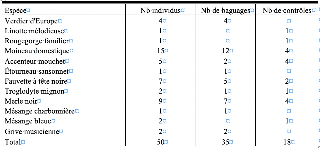 Ce dimanche matin donc, 53 oiseaux capturés et contrôlés et/ou bagués. En pièce jointe, la liste et les détails (contrôle = oiseau capturé portant déjà une bague). Presque tous sont des adultes nicheurs et tous les contrôles sont des oiseaux du jardin. Permis ces derniers notons par exemple :