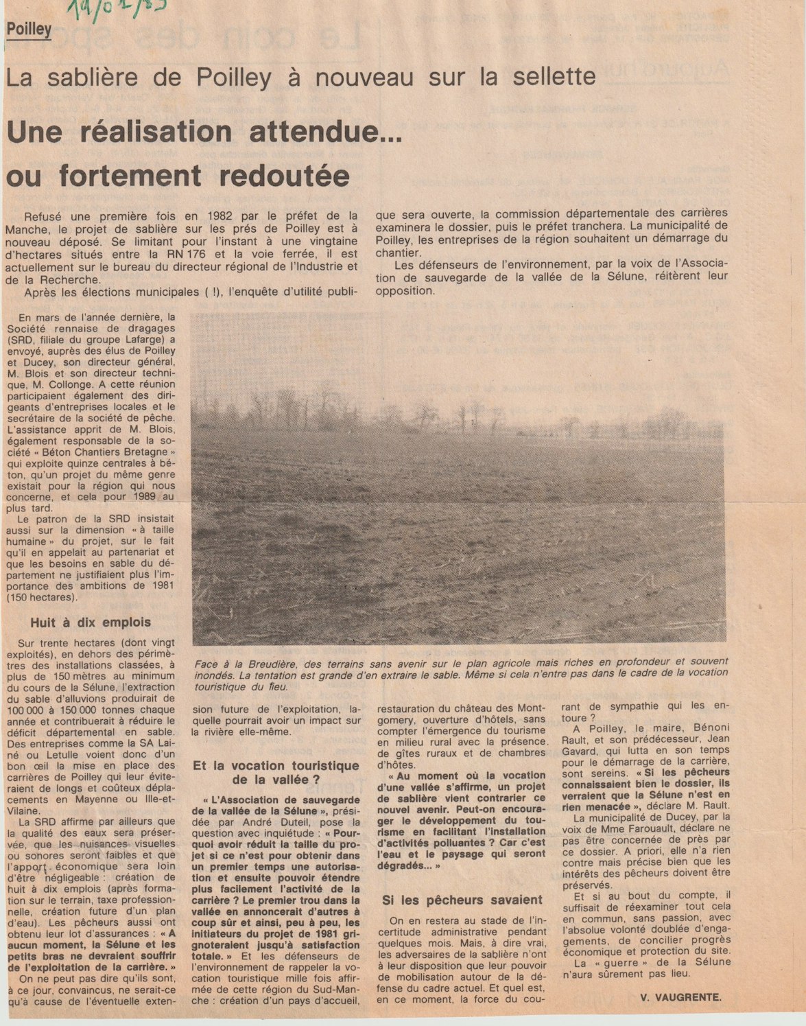 19890119- POILLEY-sablière-projet-OF Il est précisé que l'enquête publique aura lieu après les élections municipales de mi mars 1989. Les élus en place sont favorables au projet. Les pêcheurs s'opposent... "il n'y aura plus de saumons..." Le moment venu, les dossiers administratifs sont soumis à enquête publique. Pêcheurs, chasseurs, sont dans le camp des opposants, le GONm viendra aussi déposer un avis négatif.