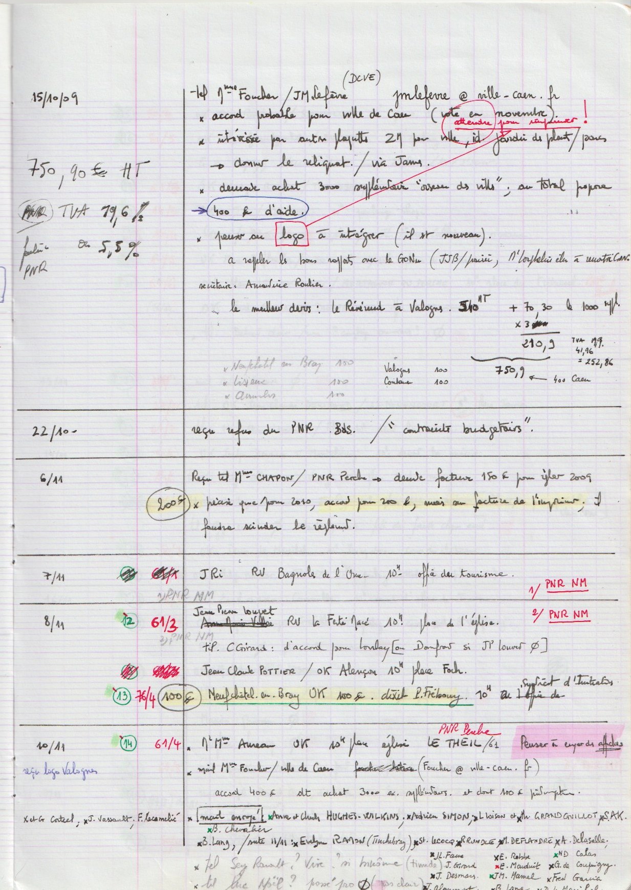 Le montage de l'équipe de 60 animateurs et la recherche des financements s'étalent du 16 juin 2009 au 19 janvier 2010, soit "un certain nombre" de courriers, mails et coups de téléphone dont une partie est résumée sur 6 pages de cahier à suivre.