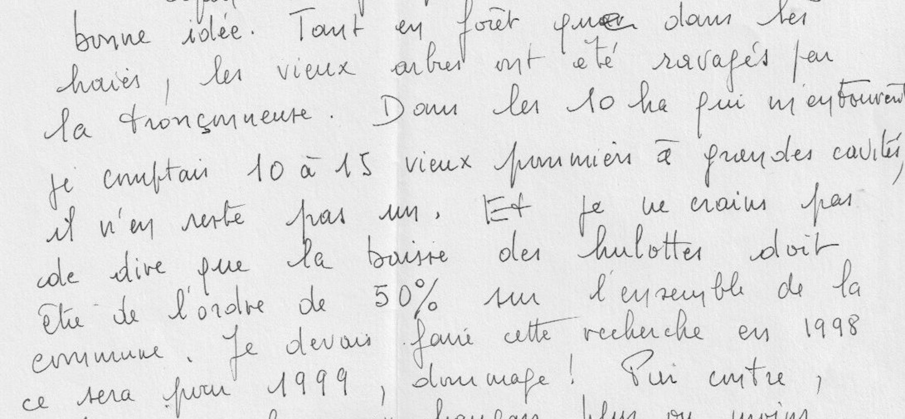 MOREAU G. (1987)- La chouette hulotte dans une commune du Perche (1962-1981). Le Cormoran, 6 (32) : 93-100. Dix ans plus tard, GMo dresse le constat de la disparition des plus vieux arbres, s'exclamant avec une triste ironie plus loin dans son courrier "Donc, un hymne à la tronçonneuse!"