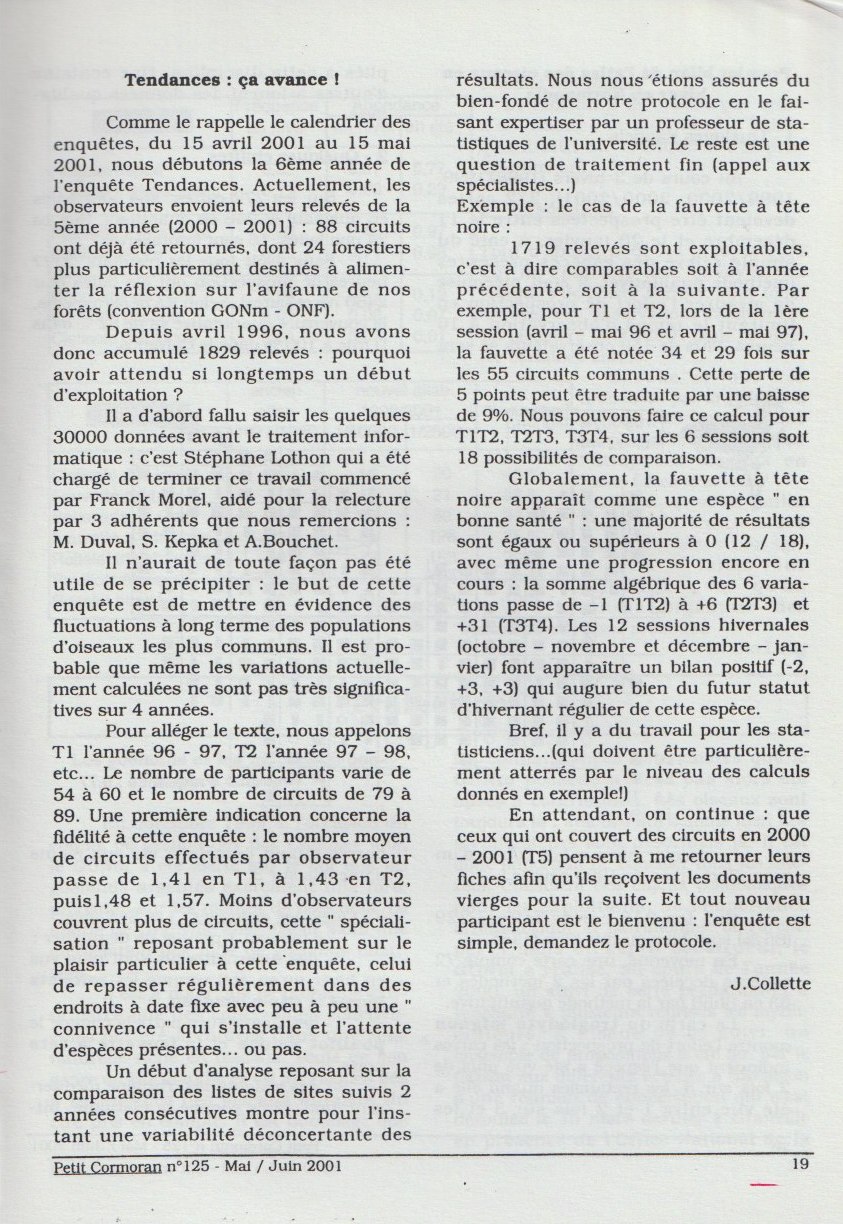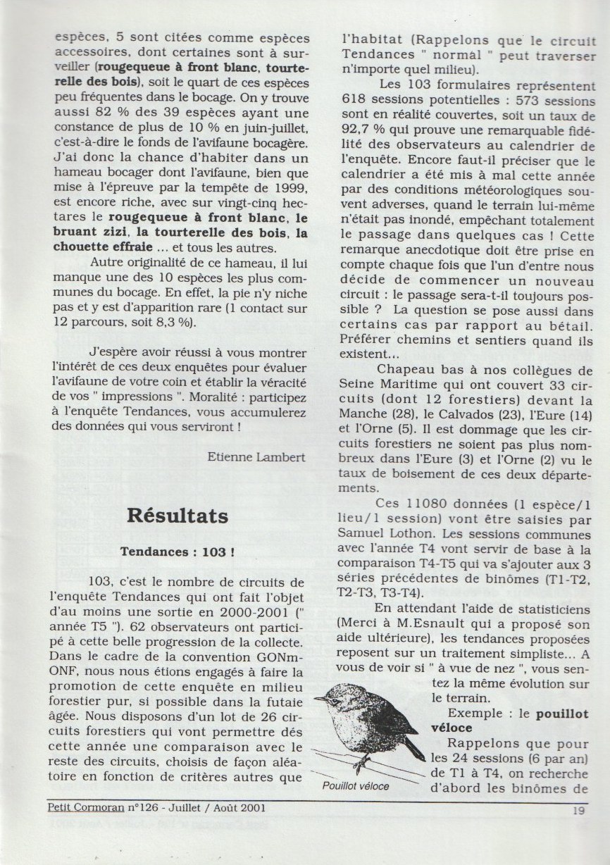 Quelques espèces nouvelles sont traitées, des résultats paraissant cohérents sont proposés. Quoique le cas de l'hirondelle rustique soit discutable. Mais c'est aussi l'objectif de l'enquête à ses débuts : critiquer la méthode? Les débutants que nous sommes après 5 années de fonctionnement obtiennent des résultats qui vont être validés 22 ans plus tard (actuellement : année 2024) : des espèces déclinent (pouillot fitis, alouette des champs, tourterelle des bois... ), d'autres progressent (pouillot véloce, fauvette à tête noire, pigeon ramier...)