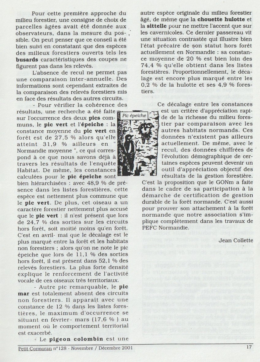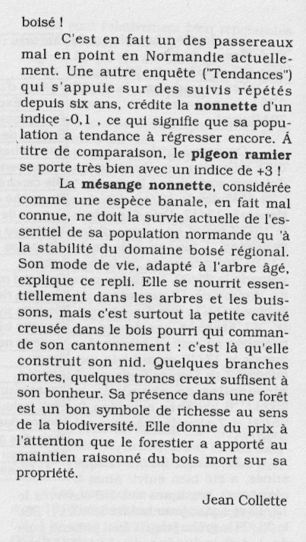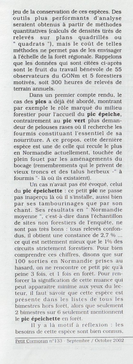 Dans le cadre du développement des relations entre l'ONF et le GONm, nous avions proposé d'utiliser l'enquête Tendances pour mettre en évidence et mesurer les nuances de l'avifaune forestière normande. Rencontres et échanges entre les deux structures à l'époque permirent aux naturalistes d'acquérir des connaissances techniques sur la gestion forestière; en contrepartie, nos données ont été de bons arguments pour affirmer le bien fondé de l'évolution des pratiques de protection du bois mort, arbres morts, îlots de vieillissement et surtout îlot de sénescence.